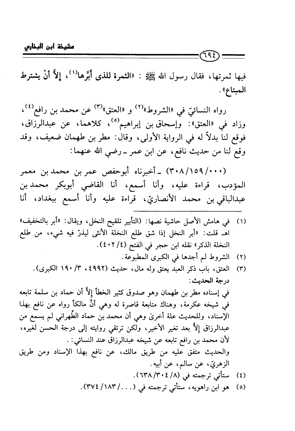 رَوَاهُ النَّسَائِيّ فِي " الشُّرُوط " و " الْعتْق " عَنْ مُحَمَّدِ بْنِ رَافِعٍ، وَزَادَ فِي " الْعِتْقِ "، وَإِسْحَاقَ بْنِ إِبْرَاهِيمَ، كِلَاهُمَا، عَنْ عَبْدِ الرَّزَّاقِ، فَوَقع لنا بَدَلا لَهُ فِي الرِّوَايَة الأولى، وَقَالَ: مَطَرُ بْنُ طَهْمَانَ ضَعِيفٌ، وَقَدْ وَقَعَ لَنَا مِنْ حَدِيثِ نَافِعٍ، عَنِ ابْنِ عُمَرَ - رَضِيَ اللَّهُ عَنْهُمَا: