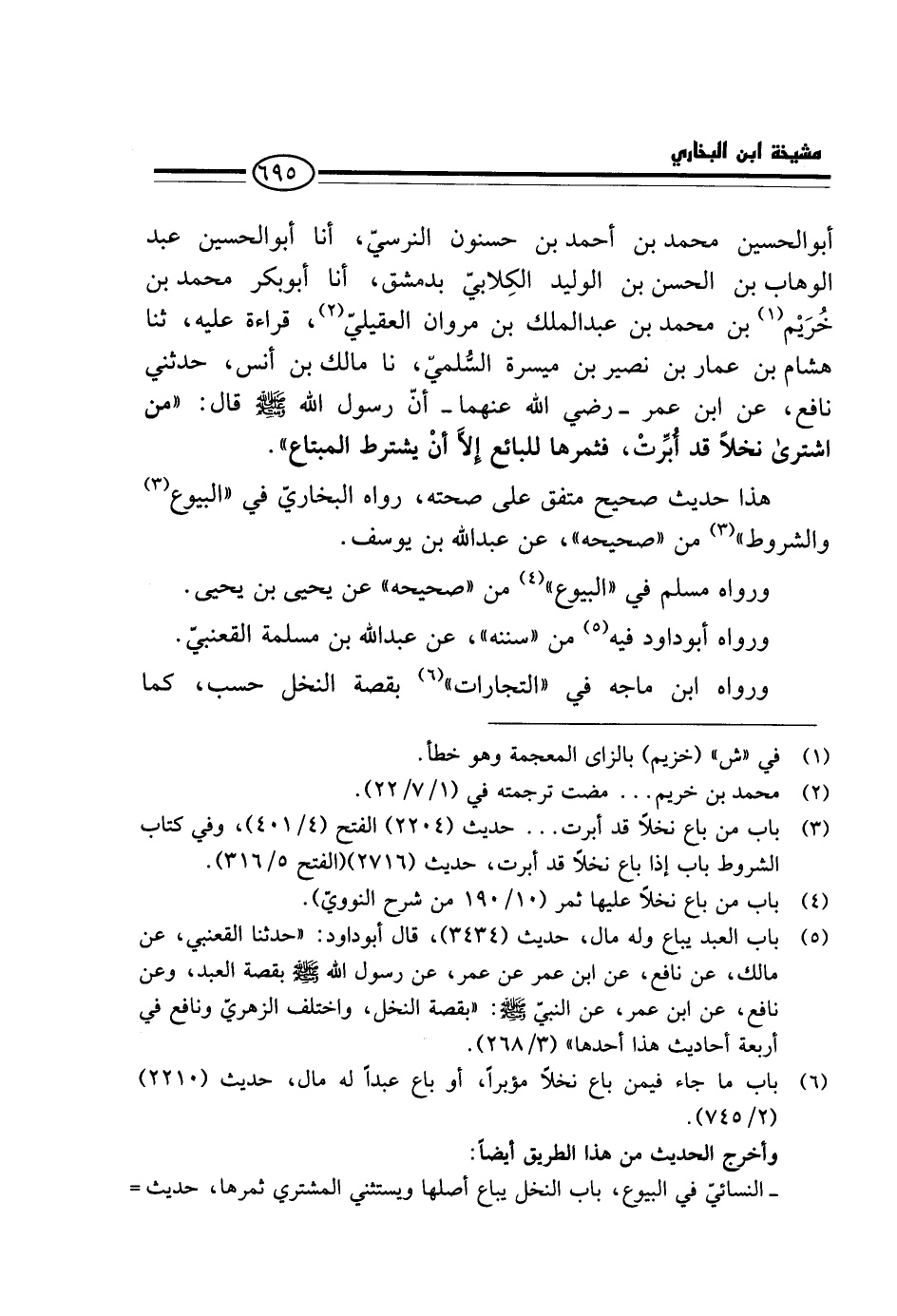 أَبُو الْحُسَيْنِ مُحَمَّدُ بْنُ أَحْمَدَ بْنِ حَسْنُونَ النَّرْسِيُّ، أَنَا أَبُو الْحُسَيْنِ عَبْدُ الْوَهَّابِ بْنُ الْحَسَنِ بْنِ الْوَلِيدِ الْكِلَابِيُّ بِدِمَشْقَ، أَنَا أَبُو بَكْرٍ مُحَمَّدُ بْنُ خُرَيْمِ بْنِ مُحَمَّدِ بْنِ عَبْدِ الْمَلِكِ بْنِ مَرْوَانَ الْعُقَيْلِيُّ، قِرَاءَةً عَلَيْهِ، ثَنَا هِشَامُ بْنُ عَمَّارِ بْنِ نُصَيْرِ بْنِ مَيْسَرَةَ السُّلَمِيُّ، نَا مَالِكُ بْنُ أَنَسٍ، حَدَّثَنِي نَافِعٌ، عَنِ ابْنِ عُمَرَ - رَضِيَ اللَّهُ عَنْهُمَا - أَن رَسُول الله - صَلَّى اللَّهُ عَلَيْهِ وَسَلَّم َ - قَالَ: " مَنِ اشْتَرَى نَخْلًا قَدْ أُبِّرَتْ، فَثَمَرُهَا لِلْبَائِعِ إِلَّا أَنْ يَشْتَرِطَ الْمُبْتَاعُ ".