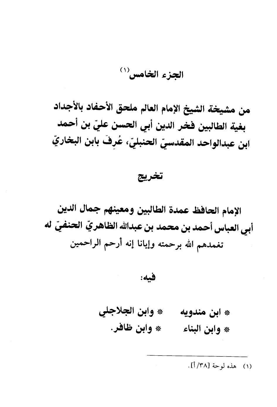 (الْجُزْء الْخَامِس من مشيخة الشَّيْخ الإِمَام الْعَالم مُلْحق الأحفاد بالأجداد بغية الطالبين فَخر الدّين أبي الْحسن عَليّ بن أَحْمد ابْن عبد الْوَاحِد الْمَقْدِسِي الْحَنْبَلِيّ، عرف بِابْن البُخَارِيّ تَخْرِيج الإِمَام الْحَافِظ عُمْدَة الطالبين ومعينهم جمال الدّين أبي الْعَبَّاس أَحْمد بن مُحَمَّد بن عبد الله الظَّاهِرِيّ الْحَنَفِيّ لَهُ تغمدهم الله برحمته وإيانا إِنَّه أرْحم الرَّاحِمِينَ فِيهِ: ابْن مندويه وَابْن الجلاجلي وَابْن الْبناء وَابْن ظافر)
