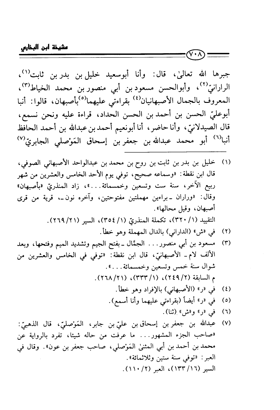 جَبَرَهَا اللَّهُ تَعَالَى، قَالَ: وَأَنَا أَبُو سَعِيدٍ خَلِيلُ بْنُ بَدْرِ بْنِ ثَابِتٍ، الرَّارَانِيُّ، وَأَبُو الْحَسَنِ مَسْعُودُ بْنُ أَبِي مَنْصُورِ بْنِ مُحَمَّدٍ الْخَيَّاطُ، الْمَعْرُوفُ بِالْجَمَّالِ الْأَصْبَهَانِيَّانِ بِقِرَاءَتِي عَلَيْهِمَا بِأَصْبَهَانَ، قَالُوا: أنبا أَبُو عَلِيٍّ الْحَسَنُ بْنُ أَحْمَدَ بْنِ الْحَسَنِ الْحَدَّادُ، قِرَاءَةً عَلَيْهِ وَنَحْنُ نَسْمَعُ، قَالَ الصَّيْدَلَانِيُّ، وَأَنَا حَاضِرٌ، أَنا أَبُو نُعَيْمٍ أَحْمَدُ بْنُ عَبْدِ اللَّهِ بْنِ أَحْمَدَ الْحَافِظُ أنبا أَبُو مُحَمَّدٍ عَبْدُ اللَّهِ بْنُ جَعْفَرِ بْنِ إِسْحَاقَ الْمَوْصِلِيُّ الْجَابِرِيُّ