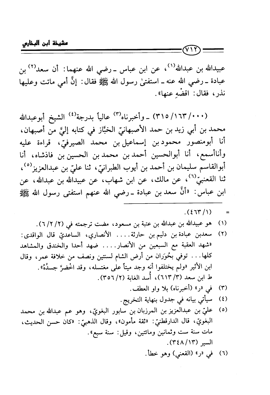 (000 / 163 / 315) - وَأَخْبَرَنَاهُ عَالِيًا بِدَرَجَةٍ الشَّيْخُ أَبُو عَبْدِ اللَّهِ مُحَمَّدُ بْنُ أَبِي زَيْدِ بْنِ حَمَدٍ الْأَصْبَهَانِيُّ الْخَبَّازُ فِي كِتَابِهِ إِلَيَّ مِنْ أَصْبَهَانَ، أَنَا أَبُو مَنْصُورٍ مَحْمُودُ بْنُ إِسْمَاعِيلَ بْنِ مُحَمَّدٍ الصَّيْرَفِيُّ، قِرَاءَةً عَلَيْهِ وَأَنَا أَسْمَعُ، أَنَا أَبُو الْحُسَيْنِ أَحْمَدُ بْنُ مُحَمَّدِ بْنِ الْحُسَيْنِ بْنِ فَاذْشَاهْ، أَنَا أَبُو الْقَاسِمِ سُلَيْمَانُ بْنُ أَحْمَدَ بْنِ أَيُّوبَ الطَّبَرَانِيُّ، ثَنَا عَلِيُّ بْنُ عَبْدِ الْعَزِيزِ، ثَنَا الْقَعْنَبِيُّ، عَنْ مَالِكٍ، عَنِ ابْنِ شِهَابٍ، عَنْ عُبَيْدِ اللَّهِ بْنِ عَبْدِ اللَّهِ، عَنِ ابْنِ عَبَّاسٍ: " أَنَّ سَعْدَ بْنَ عُبَادَةَ - رَضِيَ اللَّهُ عَنْهُمْ اسْتَفْتَى رَسُولَ الله - صَلَّى اللَّهُ عَلَيْهِ وَسَلَّم َ -