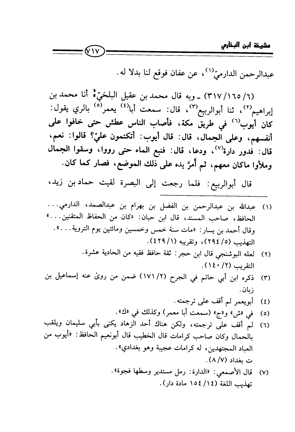 (6 / 165 / 317) - وَبِهِ قَالَ مُحَمَّدُ بْنُ عُقَيْلٍ الْبَلْخِيُّ، أَنَا مُحَمَّدُ بْنُ إِبْرَاهِيمَ، ثَنَا أَبُو الرَّبِيعِ، قَالَ: سَمِعْتُ أَبَا يَعْمُرَ بِالرَّيِّ يَقُولُ: كَانَ أَيُّوبُ فِي طَرِيقِ مَكَّةَ، فَأَصَابَ النَّاسَ عَطَشٌ حَتَّى خَافُوا عَلَى أَنْفُسِهِمْ، وَعَلَى الْجِمَالِ، قَالَ: قَالَ أَيُّوبُ: أَتَكْتُمُونَ عَلَيَّ؟ قَالُوا: نَعَمْ، قَالَ: فَدَوَّرَ دَارَةً، وَدَعَا، قَالَ: فَنَبَعَ الْمَاءُ حَتَّى رَوُوا، وَسَقَوُا الْجِمَالَ وَمَلَأُوا مَا كَانَ مَعَهُمْ، ثُمَّ أَمَرَّ يَدَهُ عَلَى ذَلِكَ الْمَوْضِعِ، فَصَارَ كَمَا كَانَ