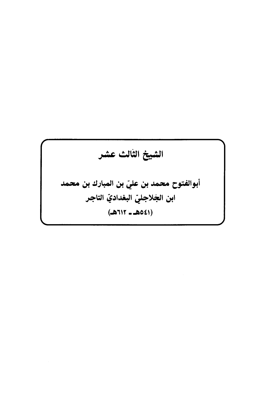 (الشَّيْخُ الثَّالِثَ عَشَرَ أَبُو الْفُتُوح مُحَمَّدُ بْنُ عَليّ بن الْمُبَارك بن مُحَمَّد ابْن الجلاجلي الْبَغْدَادِيّ التَّاجِر (541 هـ - 612 هـ))