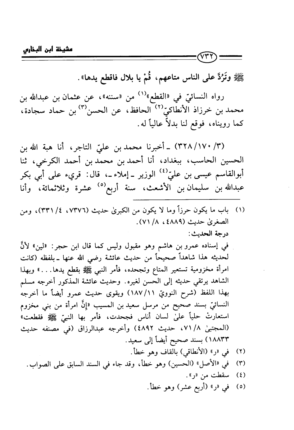 رَوَاهُ النَّسَائِيُّ فِي " الْقَطْعِ " مِنْ " سُنَنِهِ "، عَنْ عُثْمَانَ بْنِ عَبْدِ اللَّهِ بْنِ مُحَمَّدِ بْنِ خُرَّزَاذَ الْأَنْطَاكِيِّ الْحَافِظِ، عَنِ الْحَسَنِ بْنِ حَمَّادٍ سَجَّادَةَ، كَمَا رَوَيْنَاهُ، فَوَقَعَ لَنَا بَدَلًا عَالِيًا لَهُ.