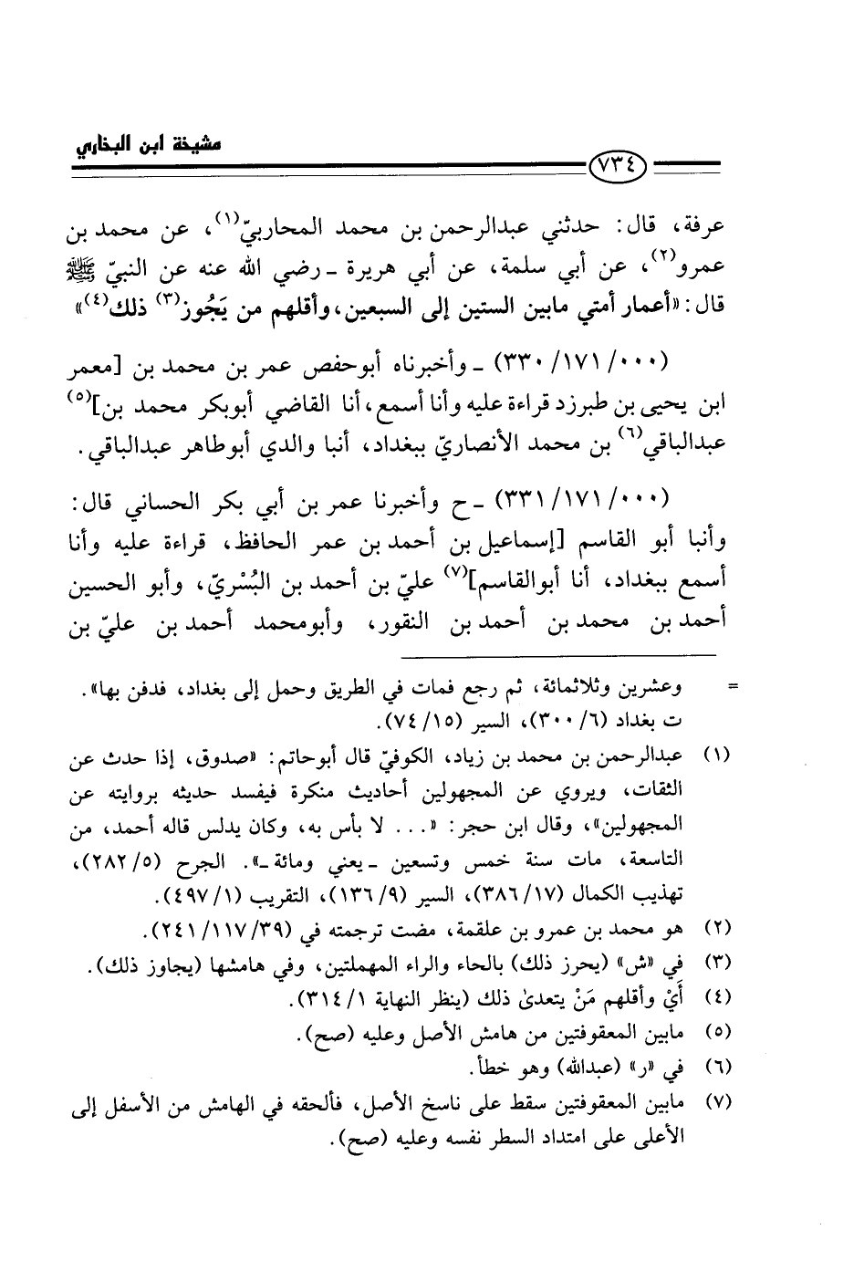 عَرَفَةَ، قَالَ: حَدَّثَنِي عَبْدُ الرَّحْمَنِ بْنُ مُحَمَّدٍ الْمُحَارِبِيُّ، عَنْ مُحَمَّدِ بْنِ عَمْرٍو، عَنْ أَبِي سَلَمَةَ، عَنْ أَبِي هُرَيْرَةَ - رَضِيَ اللَّهُ عَنْهُ عَن النَّبِي - صَلَّى اللَّهُ عَلَيْهِ وَسَلَّم َ - قَالَ: " أَعْمَارُ أُمَّتِي مَا بَيْنَ السِّتِّينَ إِلَى السَّبْعِينَ، وَأَقَلُّهُمْ مَنْ يَجُوزُ ذَلِكَ ".