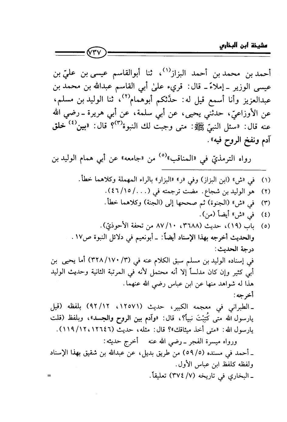 أَحْمَدُ بْنُ مُحَمَّدِ بْنِ أَحْمَدَ الْبَزَّازُ، ثَنَا أَبُو الْقَاسِمِ عِيسَى بْنُ عَلِىِّ بْنِ عِيسَى الْوَزير - إملاءً - قَالَ: قريء عَلَى أَبِي الْقَاسِمِ عَبْدِ اللَّهِ بْنِ مُحَمَّدِ بْنِ عَبْدِ الْعَزِيزِ وَأَنَا أَسْمَعُ قِيلَ لَهُ: حَدَّثَكُمْ أَبُو هَمَّامٍ، ثَنَا الْوَلِيدُ بْنُ مُسْلِمٍ، عَنِ الْأَوْزَاعِيِّ، حَدَّثَنِي يَحْيَى، عَنْ أَبِي سَلَمَةَ، عَنْ أَبِي هُرَيْرَةَ - رَضِيَ اللَّهُ عَنْهُ قَالَ: " سُئِلَ النَّبِي - صَلَّى اللَّهُ عَلَيْهِ وَسَلَّم َ -: مَتَى وَجَبَتْ لَكَ النُّبُوَّةُ؟ قَالَ: " بَيْنَ خَلْقِ آدَمَ وَنَفْخِ الرُّوح فِيهِ ".