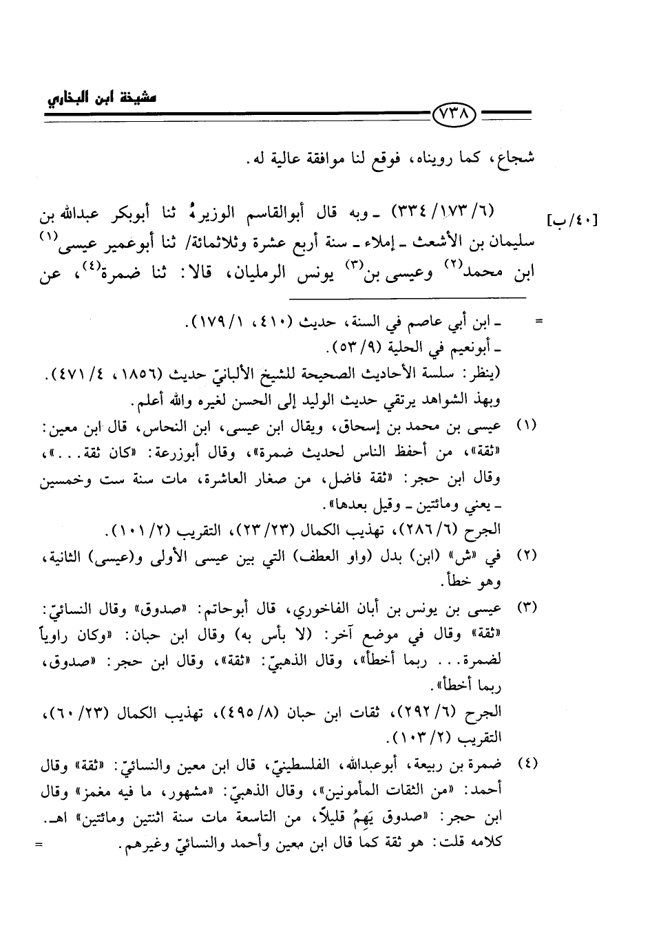 (6 / 173 / 334) - وَبِهِ قَالَ أَبُو الْقَاسِمِ الْوَزِيرُ: ثَنَا أَبُو بَكْرٍ عَبْدُ اللَّهِ بْنُ سُلَيْمَانَ بن الْأَشْعَث - إملاء - سنة أَربع عشرَة وثلاثمائة / ثَنَا أَبُو عُمَيْر عِيسَى ابْن مُحَمَّدٍ وَعِيسَى بْنُ يُونُسَ الرَّمْلِيَّانِ، قَالا: ثَنَا ضَمرَة، عَن