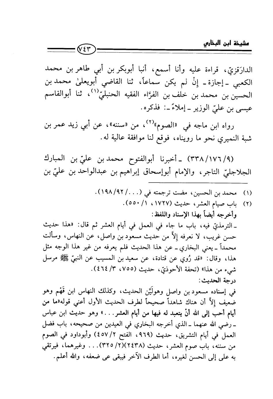 (9 / 176 / 338) - أَخْبَرَنَا أَبُو الْفُتُوح مُحَمَّدُ بْنُ عَلِيِّ بْنِ الْمُبَارَكِ الْجُلَاجِلِيُّ التَّاجِرُ، وَالْإِمَامُ أَبُو إِسْحَاقَ إِبْرَاهِيمُ بْنُ عَبْدِ الْوَاحِدِ بْنِ عَلِيِّ بْنِ