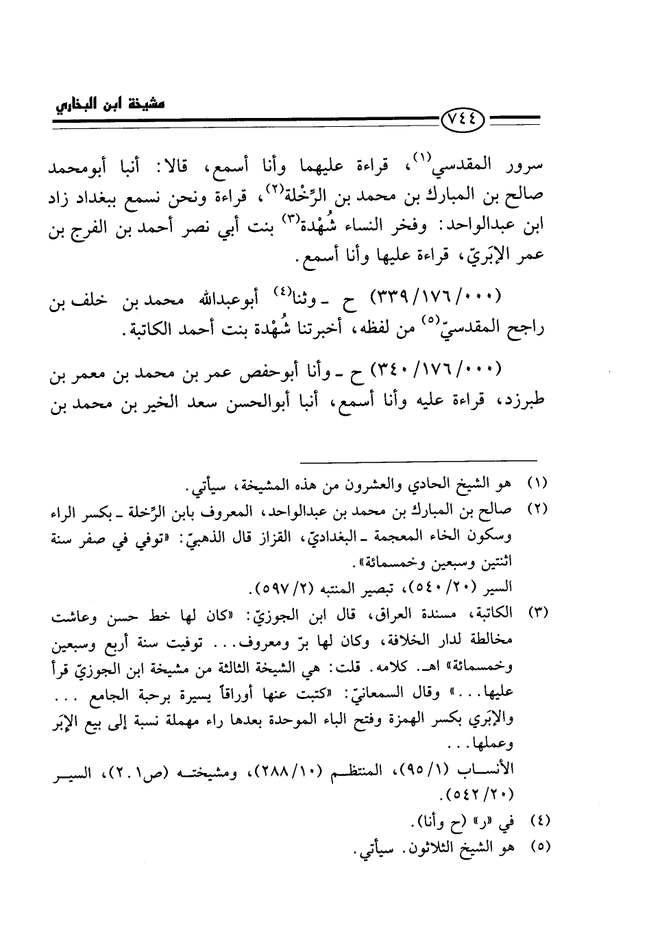 سُرُورٍ الْمَقْدِسِيُّ، قِرَاءَةً عَلَيْهِمَا وَأَنَا أَسْمَعُ، قَالا: أنبا أَبُو مُحَمَّدٍ صَالِح بْنُ الْمُبَارَكِ بْنِ مُحَمَّدِ بْنِ الرِّخْلَةِ، قِرَاءَةً وَنَحْنُ نَسْمَعُ بِبَغْدَادَ زَادَ ابْنُ عَبْدِ الْوَاحِدِ، وَفَخْرُ النِّسَاءِ شُهْدَةُ بِنْتُ أَبِي نَصْرٍ أَحْمَدَ بْنِ الْفَرَجِ بْنِ عمر الإبري، قِرَاءَة عَلَيْهَا وَأَنَا أَسْمَعُ.