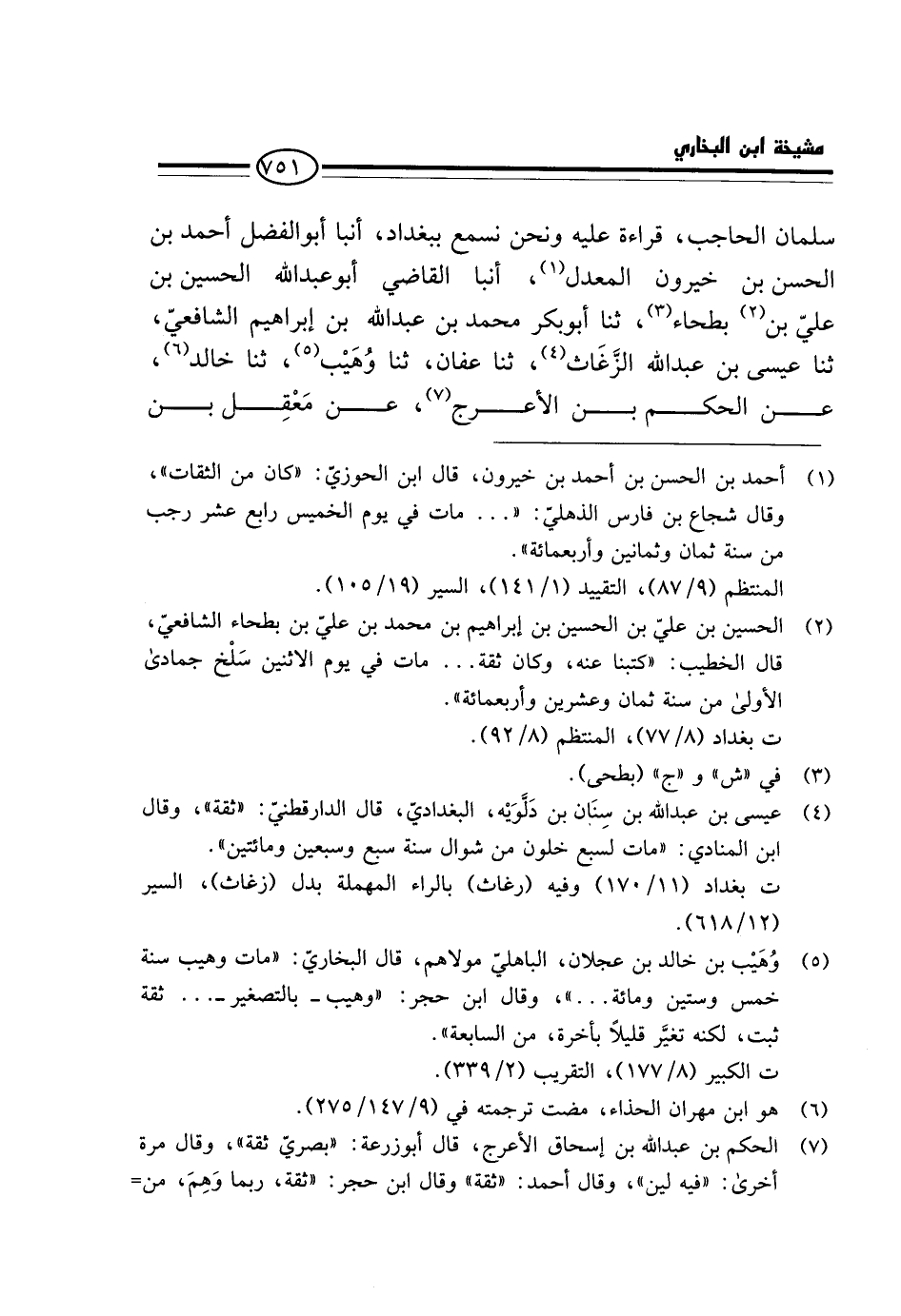 سَلْمَانَ الْحَاجِبُ، قِرَاءَةً عَلَيْهِ وَنَحْنُ نَسْمَعُ بِبَغْدَادَ، أنبا أَبُو الْفَضْلِ أَحْمَدُ بْنُ الْحَسَنِ بْنِ خَيْرُونَ الْمُعَدَّلُ، أنبا الْقَاضِي أَبُو عَبْدِ اللَّهِ الْحُسَيْنُ بْنُ عَلِيِّ بْنِ بَطْحَاءَ، ثَنَا أَبُو بَكْرٍ مُحَمَّدُ بْنُ عَبْدِ اللَّهِ بْنِ إِبْرَاهِيمَ الشَّافِعِيُّ، ثَنَا عِيسَى بْنُ عَبْدِ اللَّهِ الزَّغَاثُ، ثَنَا عَفَّانُ، ثَنَا وُهَيْبٌ، ثَنَا خَالِدٌ، عَنِ الْحَكَمِ بْنِ الْأَعْرَجِ، عَنْ مَعْقِلِ بْنِ