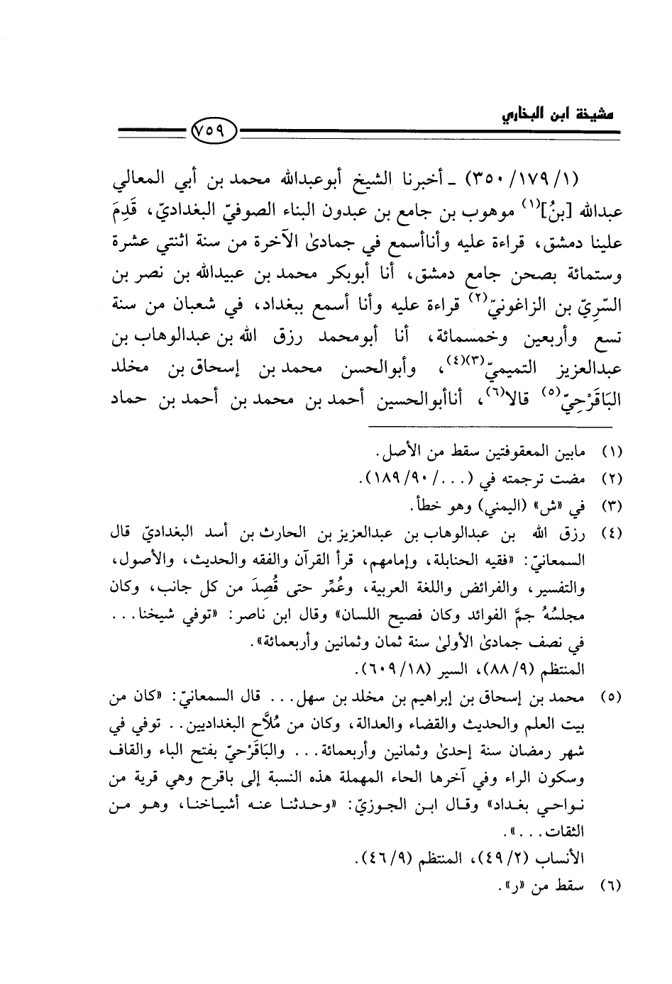(1 / 179 / 350) - أَخْبَرَنَا الشَّيْخُ أَبُو عَبْدِ اللَّهِ مُحَمَّدُ بْنُ أَبِي الْمَعَالِي عبد الله [بن] موهوب بن جَامِعِ بْنِ عَبْدُونٍ الْبَنَّاءُ الصُّوفِيُّ الْبَغْدَادِيُّ، قَدِمَ عَلَيْنَا دِمَشْقَ، قِرَاءَةً عَلَيْهِ وَأَنَا أَسْمَعُ فِي جُمَادَى الْآخِرَة من سنة اثْنَتَيْ عشرَة وسِتمِائَة بِصَحْنِ جَامِعِ دِمَشْقَ، أَنا أَبُو بَكْرٍ مُحَمَّدُ بْنُ عُبَيْدِ اللَّهِ بْنِ نَصْرِ بْنِ السَّرِيِّ بن الزغواني قِرَاءَةً عَلَيْهِ وَأَنَا أَسْمَعُ بِبَغْدَادَ، فِي شَعْبَانَ من سنة تسع وَأَرْبَعين وَخَمْسمِائة، أَنا أَبُو مُحَمَّدٍ رِزْقُ اللَّهِ بْنُ عَبْدِ الْوَهَّابِ بْنِ عَبْدِ الْعَزِيزِ التَّمِيمِيُّ، وَأَبُو الْحَسَنِ مُحَمَّدُ بْنُ إِسْحَاقَ بْنِ مَخْلَدٍ الْبَاقَرْحِيُّ قَالا، أَنَا أَبُو الْحُسَيْنِ أَحْمَدُ بْنُ مُحَمَّدِ بْنِ أَحْمَدَ بْنِ حَمَّادٍ