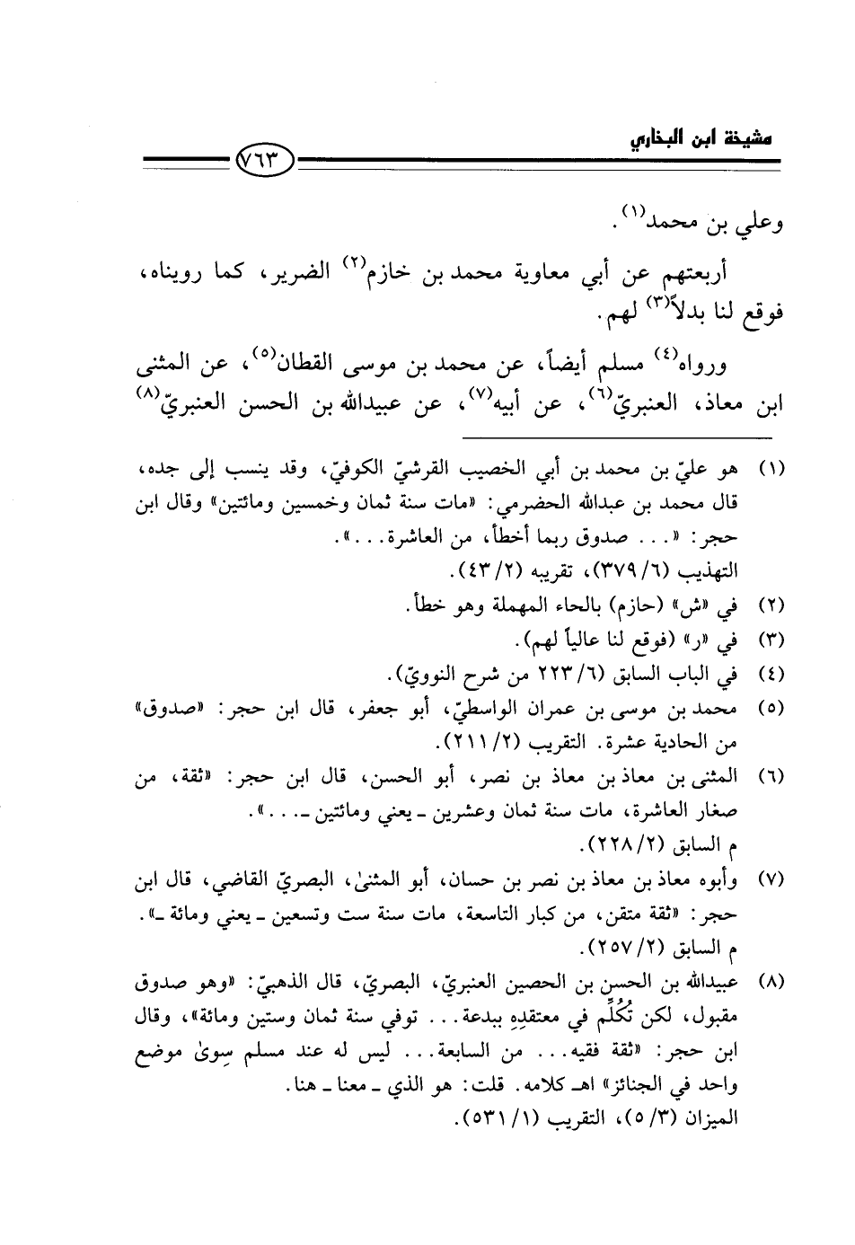 أربعتهم عَن أَبِي مُعَاوِيَة مُحَمَّد بن خازم الضَّرِير، كَمَا روينَاهُ، فَوَقع لنا بَدَلا لَهُم.