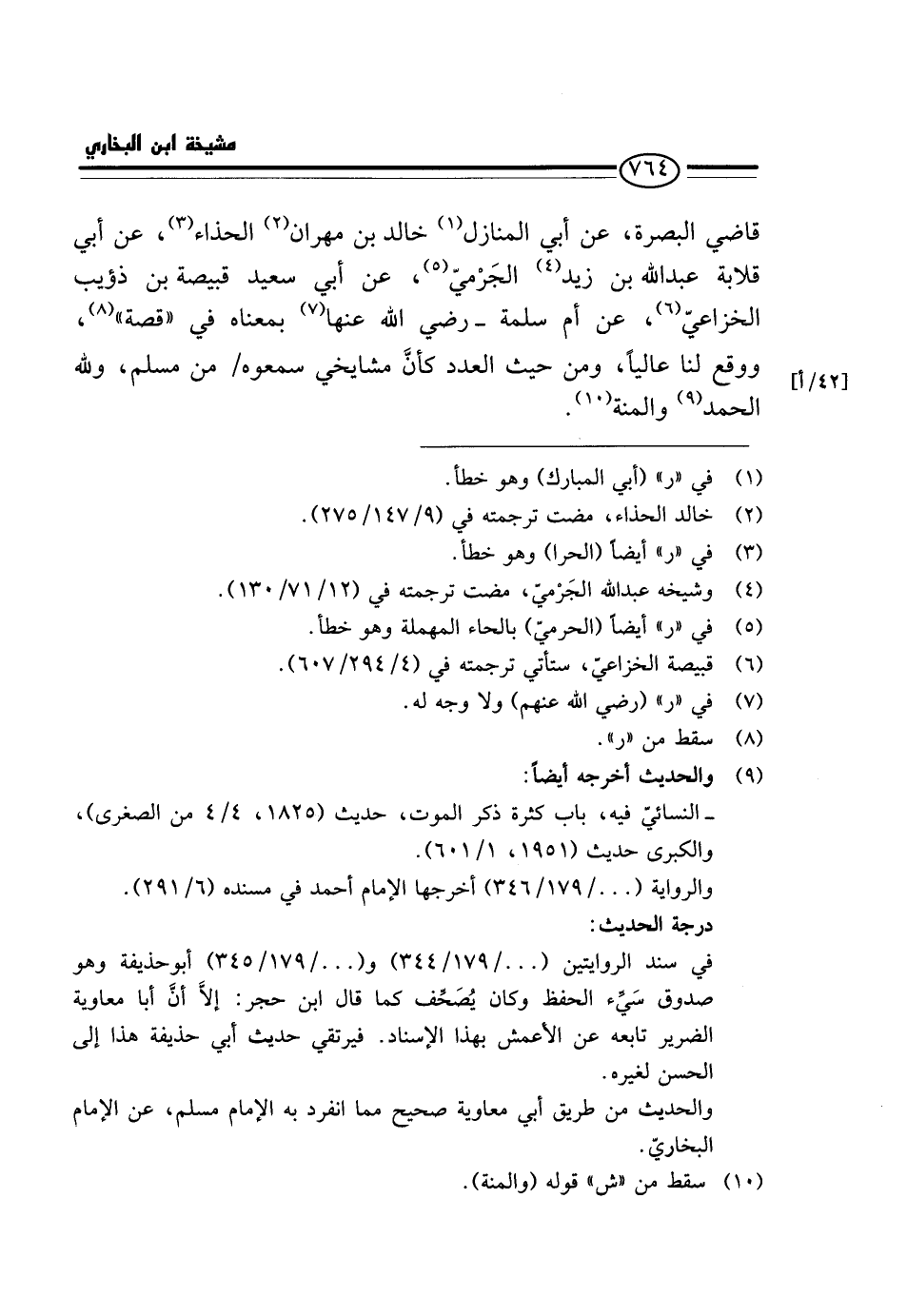 قَاضِي الْبَصْرَة، عَن أَبِي الْمنَازل خَالِد بن مهْرَان الْحذاء، عَن أَبِي قلَابَة عبد الله بن زيد الْجرْمِي، عَن أَبِي سعيد قبيصَة بن ذُؤَيْب الْخُزَاعِيّ، عَن أم سَلمَة - رَضِي الله عَنْهَا بِمَعْنَاهُ فِي " قصَّة "، وَوَقع لنا عَالِيًا، وَمِنْ حَيْثُ الْعَدَدِ كَأَنَّ مَشَايِخِي سَمِعُوهُ / من مُسلم، وَللَّه الْحَمد والْمنَّة.