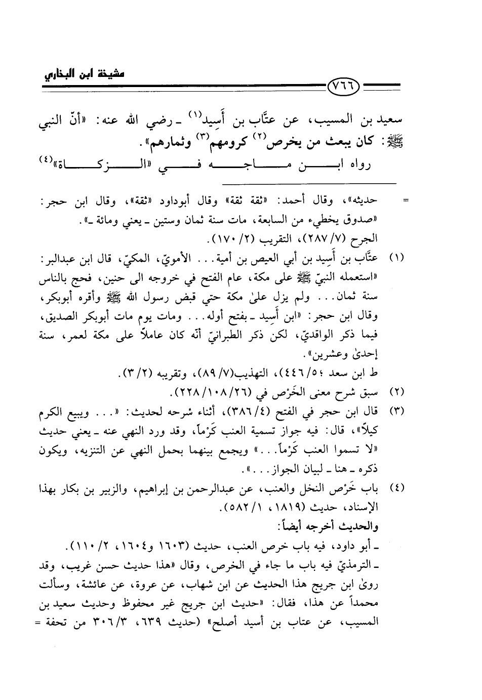 سَعِيدِ بْنِ الْمُسَيِّبِ، عَنْ عَتَّابِ بْنِ أَسِيدٍ - رَضِي الله عَنهُ: " أَن النَّبِي - صَلَّى اللَّهُ عَلَيْهِ وَسَلَّم َ -: كَانَ يَبْعَثُ مَنْ يَخْرُصُ كُرُومَهُمْ وَثِمَارَهُمْ ".