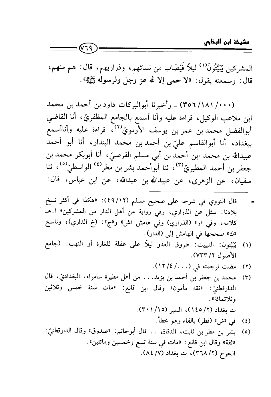 (000 / 181 / 356) - وَأَخْبَرَنَا أَبُو الْبَرَكَاتِ دَاوُدُ بْنُ أَحْمَدَ بْنِ مُحَمَّد ابْن مُلاعِبٍ الْوَكِيلُ، قِرَاءَةً عَلَيْهِ وَأَنَا أَسْمَعُ بِالْجَامِعِ الْمُظَفَّرِيِّ، أَنا الْقَاضِي أَبُو الْفَضْلِ مُحَمَّدُ بْنُ عُمَرَ بْنِ يُوسُفَ الْأُرْمَوِيُّ، قِرَاءَةً عَلَيْهِ وَأَنَا أَسْمَعُ بِبَغْدَادَ، أَنَا أَبُو الْقَاسِمِ عَلِيُّ بْنُ أَحْمَدَ بْنِ مُحَمَّدٍ الْبُنْدَارُ، أَنا أَبُو أَحْمَدَ عبيد الله بن مُحَمَّد ابْن أَحْمَدَ بْنِ أَبِي مُسْلِمٍ الْفَرَضِيُّ، أَنا أَبُو بَكْرٍ مُحَمَّدُ بْنُ جَعْفَرِ بْنِ أَحْمَدَ الْمَطِيرِيُّ، ثَنَا أَبُو أَحْمَدَ بِشْرُ بْنُ مَطَرٍ الْوَاسِطِيُّ، ثَنَا سُفْيَانُ، عَنِ الزُّهْرِيِّ، عَنْ عُبَيْدِ اللَّهِ بْنِ عَبْدِ اللَّهِ، عَنِ ابْنِ عَبَّاسٍ، قَالَ: