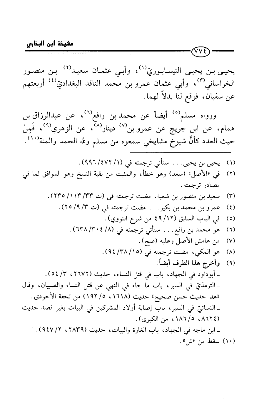 يَحْيَى بن يَحْيَى النَّيْسَابُورِي، وَأبي عُثْمَان سعيد بن مَنْصُور الْخُرَاسَانِي، وَأبي عُثْمَان عَمْرو بن مُحَمَّد النَّاقِد الْبَغْدَادِيّ أربعتهم عَن سُفْيَان، فَوَقع لنا بَدَلا لَهما.