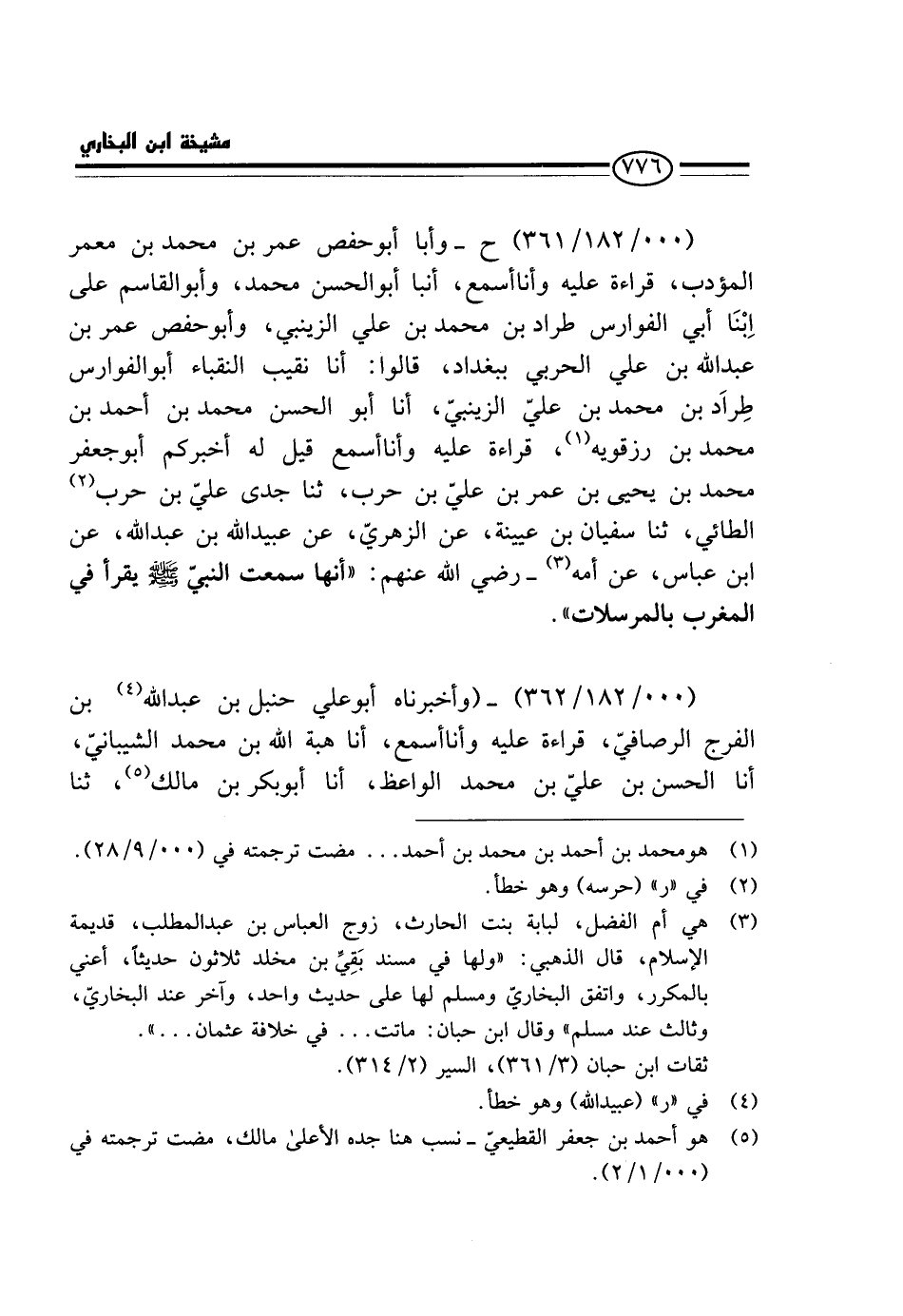 (000 / 182 / 361) ح - وَأَبا أَبُو حَفْصٍ عُمَرُ بْنُ مُحَمَّدِ بْنِ مَعْمَرِ الْمُؤَدِّبُ، قِرَاءَةً عَلَيْهِ وَأَنَا أَسْمَعُ، أنبا أَبُو الْحَسَنِ مُحَمَّدٌ، وَأَبُو الْقَاسِمِ عَلِيٌّ ابْنَا أَبِي الْفَوَارِسِ طِرَادِ بْنِ مُحَمَّدِ بْنِ عَلِيٍّ الزَّيْنَبِيِّ، وَأَبُو حَفْصٍ عُمَرُ بْنُ عَبْدِ اللَّهِ بْنِ عَلِيٍّ الْحَرْبِيُّ بِبَغْدَادَ، قَالُوا: أَنا نَقِيبُ النُّقَبَاءِ أَبُو الْفَوَارِسِ طِرَادُ بْنُ مُحَمَّدِ بْنِ عَلِيٍّ الزَّيْنَبِيُّ، أَنا أَبُو الْحَسَنِ مُحَمَّدُ بْنُ أَحْمَدَ بْنِ مُحَمَّدِ بْنِ رِزْقَوَيْهِ، قِرَاءَةً عَلَيْهِ وَأَنَا أَسْمَعُ قِيلَ لَهُ أَخْبَرَكُمْ أَبُو جَعْفَرٍ مُحَمَّدُ بْنُ يَحْيَى بْنِ عُمَرَ بْنِ عَلِيِّ بْنِ حَرْبٍ، ثَنَا جَدِّي عَلِيُّ بْنُ حَرْبٍ الطَّائِيُّ، ثَنَا سُفْيَانُ بْنُ عُيَيْنَةَ، عَنِ الزُّهْرِيِّ، عَنْ عُبَيْدِ اللَّهِ بْنِ عَبْدِ اللَّهِ، عَنِ ابْنِ عَبَّاسٍ، عَنْ أُمِّهِ - رَضِيَ اللَّهُ عَنْهُمْ: " أَنَّهَا سَمِعت النَّبِي - صَلَّى اللَّهُ عَلَيْهِ وَسَلَّم َ - يقْرَأ فِي الْمغرب بالمرسلات ".