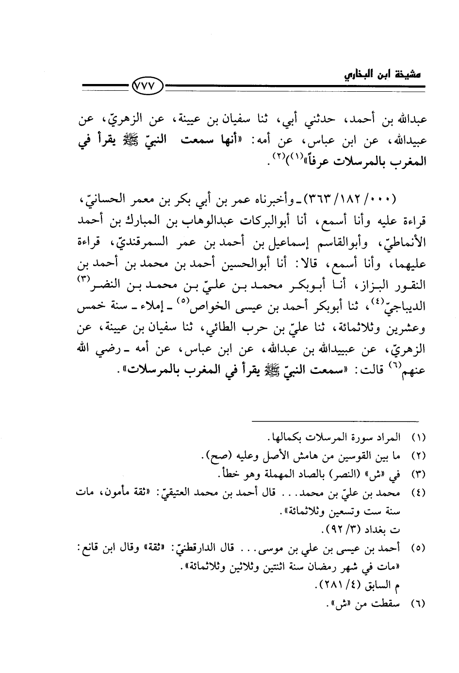 (000 / 182 / 363) - وَأَخْبَرَنَاهُ عُمَرُ بْنُ أَبِي بَكْرِ بْنِ مَعْمَرٍ الْحَسَّانِيُّ، قِرَاءَةً عَلَيْهِ وَأَنَا أَسْمَعُ، أَنَا أَبُو الْبَرَكَاتِ عَبْدُ الْوَهَّابِ بْنُ الْمُبَارَكِ بْنِ أَحْمَدَ الْأَنْمَاطِيُّ، وَأَبُو الْقَاسِمِ إِسْمَاعِيلُ بْنُ أَحْمَدَ بْنِ عُمَرَ السَّمَرْقَنْدِيُّ، قِرَاءَةً عَلَيْهِمَا، وَأَنَا أَسْمَعُ، قَالَا: أَنَا أَبُو الْحُسَيْنِ أَحْمَدُ بْنُ مُحَمَّدِ بْنِ أَحْمَدَ بْنِ النَّقُّورِ الْبَزَّازُ، أَنَا أَبُو بَكْرٍ مُحَمَّدُ بْنُ عَلِيِّ بْنِ مُحَمَّدِ بْنِ النَّضْرِ الدِّيبَاجِيُّ، ثَنَا أَبُو بَكْرٍ أَحْمَدُ بْنُ عِيسَى الْخَواص - إملاء - سنة خمس وَعشْرين وثلاثمائة، ثَنَا عَلِيُّ بْنُ حَرْبٍ الطَّائِيُّ ثَنَا سُفْيَانُ بْنُ عُيَيْنَةَ، عَنِ الزُّهْرِيِّ، عَنْ عُبَيْدِ اللَّهِ بْنِ عَبْدِ اللَّهِ، عَنِ ابْنِ عَبَّاسٍ، عَنْ أمه - رَضِي الله عَنْهُم قَالَت: " سَمِعت النَّبِي - صَلَّى اللَّهُ عَلَيْهِ وَسَلَّم َ - يقْرَأ فِي الْمغرب بالمرسلات ".