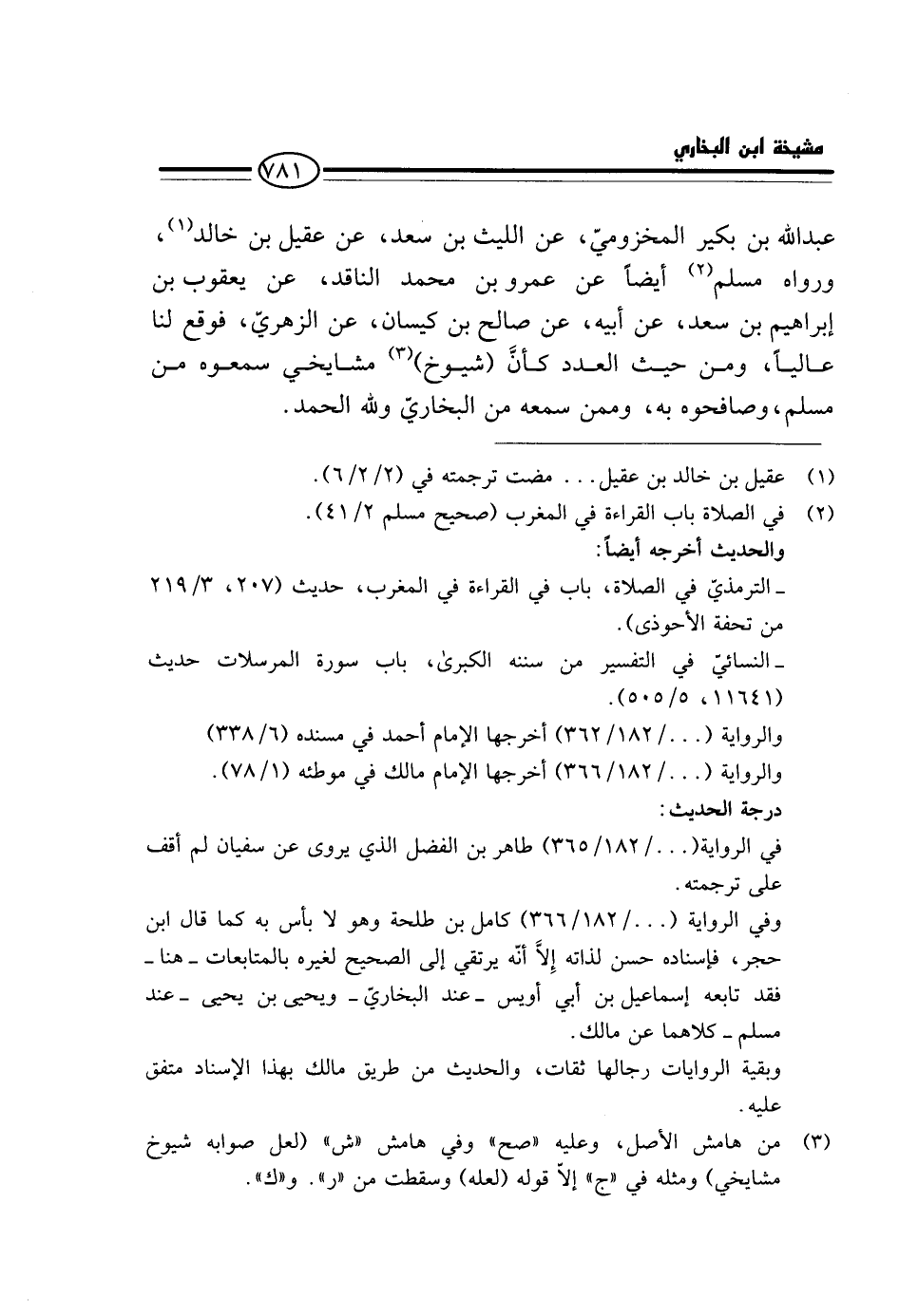 عبد الله بن بكير المَخْزُومِي، عَن اللَّيْث بن سعد، عَن عقيل بن خَالِد، وَرَوَاهُ مُسلم أَيْضا عَن عَمْرو بن مُحَمَّد النَّاقِد، عَنْ يَعْقُوبَ بْنِ إِبْرَاهِيمَ بْنِ سَعْدٍ، عَنْ أَبِيه، عَن صَالح بن كيسَان، عَن الزُّهْرِيّ، فَوَقَعَ لَنَا عَالِيًا، وَمِنْ حَيْثُ الْعَدَدِ كَأَنَّ (شُيُوخ) مشايخي سَمِعُوهُ من مُسلم، وصافحوه بِهِ، وَمِمَّنْ سَمعه من البُخَارِيّ وَللَّه الْحَمد.