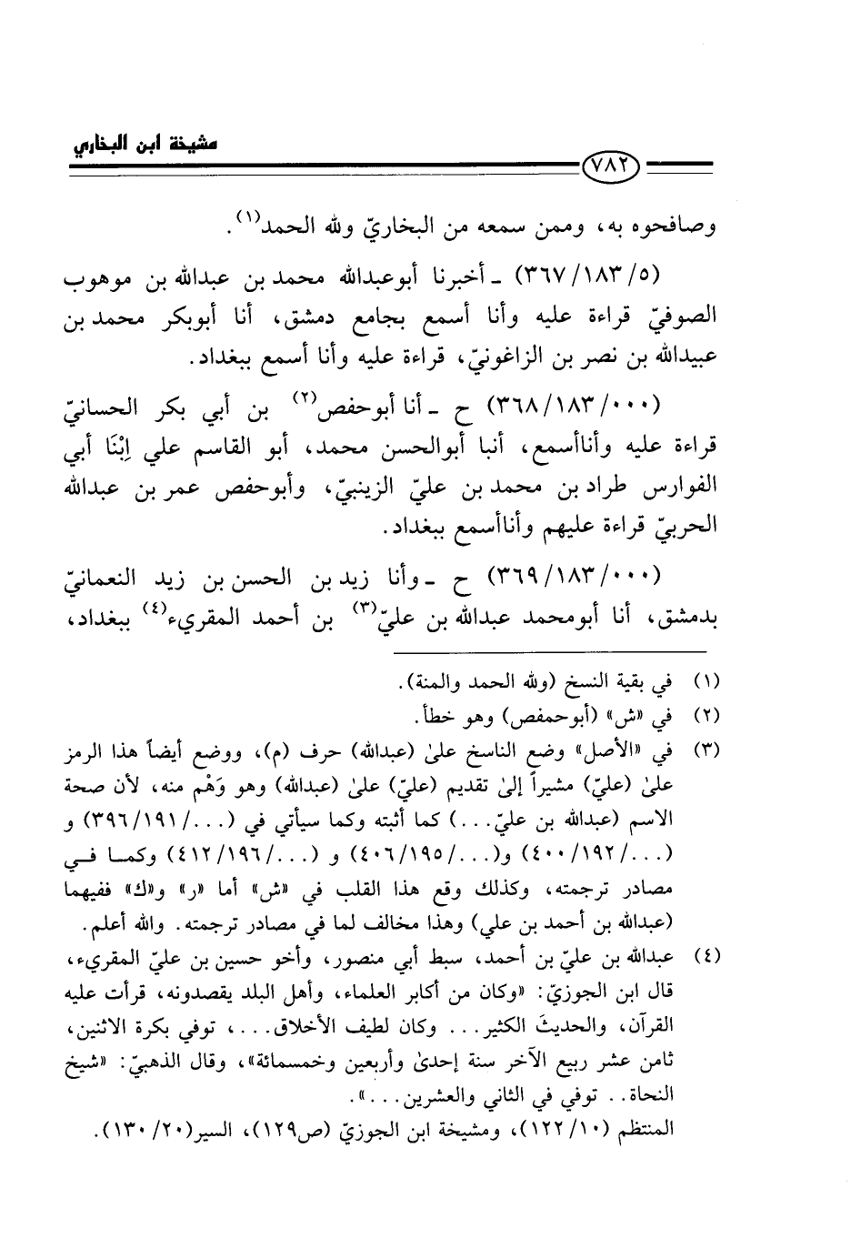 (000 / 183 / 369) ح - وَأَنا زَيْدُ بْنُ الْحَسَنِ بْنِ زَيْدٍ النُّعْمَانِيُّ بِدِمَشْقَ، أَنا أَبُو مُحَمَّدٍ عبد الله بن عَليّ بن أَحْمد المقريء بِبَغْدَاد،