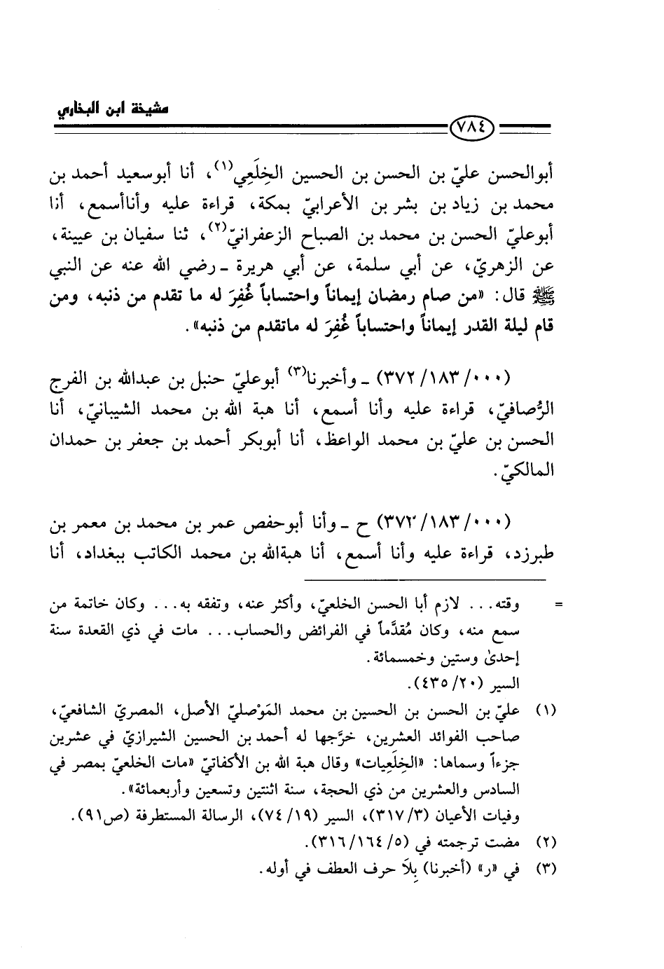 أَبُو الْحَسَنِ عَلِيُّ بْنُ الْحَسَنِ بْنِ الْحُسَيْنِ الخلعي، أَنا أَبُو سعد أَحْمَدُ بْنُ مُحَمَّدِ بْنِ زِيَادِ بْنِ بِشْرِ بْنِ الأَعْرَابِيِّ بِمَكَّةَ، قِرَاءَةً عَلَيْهِ وَأَنَا أَسْمَعُ، أَنا أَبُو عَلِيٍّ الْحَسَنُ بْنُ مُحَمَّدِ بْنِ الصَّبَّاحِ الزَّعْفَرَانِيُّ، ثَنَا سُفْيَانُ بْنُ عُيَيْنَةَ، عَنِ الزُّهْرِيِّ، عَنْ أَبِي سَلَمَةَ، عَنْ أَبِي هُرَيْرَةَ - رَضِي الله عَنهُ عَن النَّبِي - صَلَّى اللَّهُ عَلَيْهِ وَسَلَّم َ - قَالَ: " مَنْ صَامَ رَمَضَانَ إِيمَانًا وَاحْتِسَابًا غُفِرَ لَهُ مَا تَقَدَّمَ مِنْ ذَنْبِهِ، وَمَنْ قَامَ لَيْلَةَ الْقَدْرِ إِيمَانًا وَاحْتِسَابًا غُفِرَ لَهُ مَا تَقَدَّمَ مِنْ ذَنْبِهِ ".
