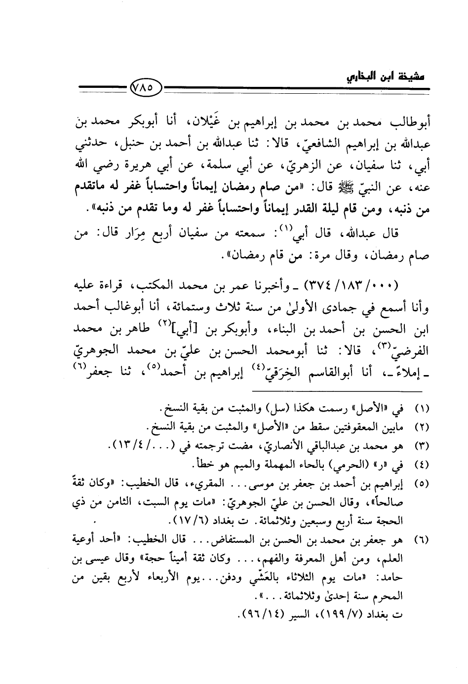 (000 / 183 / 374) - وَأَخْبَرَنَا عُمَرُ بْنُ مُحَمَّدٍ الْمُكْتِبُ، قِرَاءَةً عَلَيْهِ وَأَنَا أَسْمَعُ فِي جُمَادَى الْأُولَى مِنْ سنة ثَلَاث وسِتمِائَة، أَنا أَبُو غَالب أَحْمد ابْن الْحَسَنِ بْنِ أَحْمَدَ بْنِ الْبَنَّاءِ، وَأَبُو بَكْرِ بْنُ [أَبِي] طَاهِرِ بْنِ مُحَمَّدٍ الْفَرَضِيُّ، قَالا: ثَنَا أَبُو مُحَمَّدٍ الْحَسَنُ بْنُ عَلِيِّ بْنِ مُحَمَّدٍ الْجَوْهَرِيُّ - إِمْلاءً -، أَنا أَبُو الْقَاسِمِ الْخِرَقِيُّ إِبْرَاهِيم بن أَحْمد، ثَنَا جَعْفَر