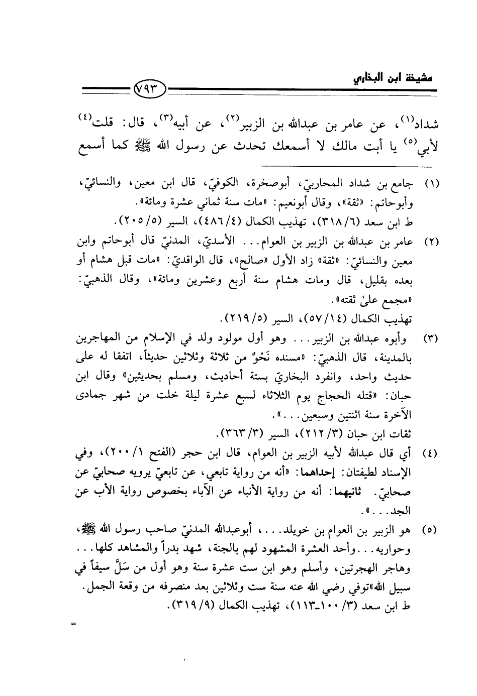 شَدَّادٍ، عَنْ عَامِرِ بْنِ عَبْدِ اللَّهِ بْنِ الزُّبَيْرِ، عَنْ أَبِيهِ، قَالَ: قُلْتُ لأَبِي يَا أَبَت مَالك لَا أسمعك تحدث عَن رَسُول الله - صَلَّى اللَّهُ عَلَيْهِ وَسَلَّم َ - كَمَا أسمع