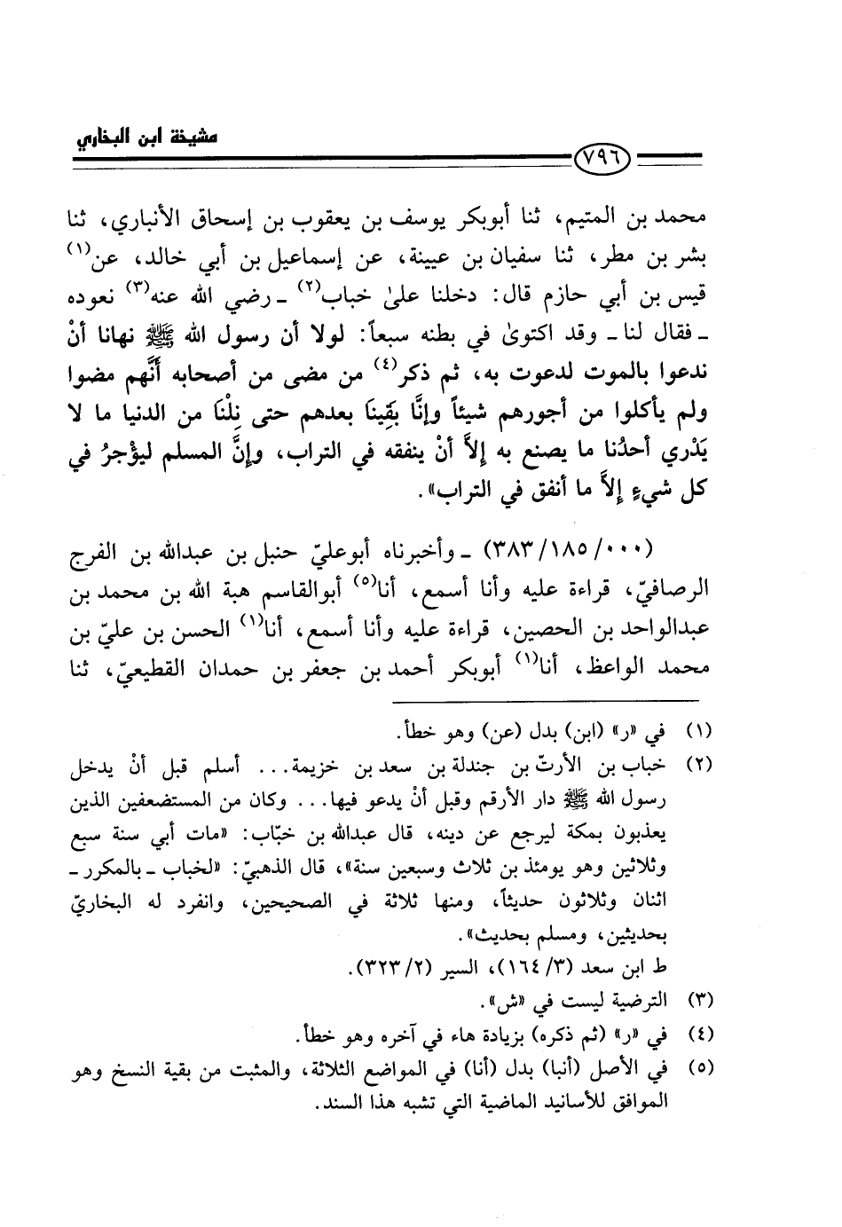 مُحَمَّدِ بْنِ الْمُتَيَّمِ، ثَنَا أَبُو بَكْرٍ يُوسُفُ بْنُ يَعْقُوبَ بْنِ إِسْحَاقَ الأَنْبَارِيُّ، ثَنَا بِشْرُ بْنُ مَطَرٍ، ثَنَا سُفْيَانُ بْنُ عُيَيْنَةَ، عَنِ إِسْمَاعِيلَ بْنِ أَبِي خَالِدٍ، عَنْ قَيْسِ بْنِ أَبِي حَازِمٍ قَالَ: دَخَلْنَا عَلَى خَبَّابٍ - رَضِيَ اللَّهُ عَنْهُ نَعُودُهُ - فَقَالَ لَنَا - وَقَدِ اكْتَوَى فِي بَطْنِهِ سَبْعًا: لَوْلا أَنَّ رَسُولَ اللَّهِ - صَلَّى اللَّهُ عَلَيْهِ وَسَلَّم َ - نَهَانَا أَن ندعوا بِالْمَوْتِ لَدَعَوْتُ بِهِ، ثُمَّ ذَكَرَ مَنْ مَضَى مِنْ أَصْحَابِهِ أَنَّهُمْ مَضَوْا وَلَمْ يَأْكُلُوا مِنْ أُجُورِهِمْ شَيْئًا وَإِنَّا بَقِينَا بَعْدَهُمْ حَتَّى نِلْنَا مِنَ الدُّنْيَا مَا لَا يَدْرِي أَحَدُنَا مَا يَصْنَعُ بِهِ إِلا أَنْ يُنْفِقَهُ فِي التُّرَابِ، وَإِنَّ الْمُسْلِمَ لَيُؤْجَرُ فِي كُلِّ شَيْءٍ إِلا مَا أَنْفَقَ فِي التُّرَابِ ".