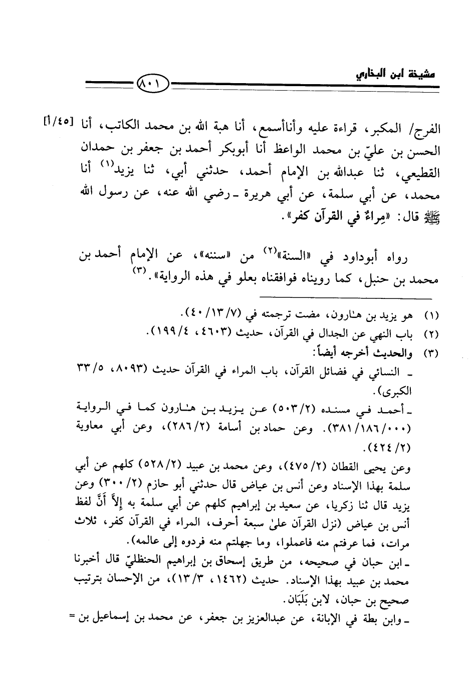 الْفَرَجِ / الْمُكَبِّرُ، قِرَاءَةً عَلَيْهِ وَأَنَا أَسْمَعُ، أَنَا هِبَةُ اللَّهِ بْنُ مُحَمَّدٍ الْكَاتِبُ، أَنَا الْحَسَنُ بْنُ عَلِيِّ بْنِ مُحَمَّدٍ الْوَاعِظُ أَنَا أَبُو بَكْرٍ أَحْمَدُ بْنُ جَعْفَرِ بْنِ حَمْدَانَ الْقَطِيعِيُّ، ثَنَا عبد الله بن الإِمَامِ أَحْمَدَ، حَدَّثَنِي أَبِي، ثَنَا يَزِيدُ أَنا مُحَمَّدٌ، عَنْ أَبِي سَلَمَةَ، عَنْ أَبِي هُرَيْرَةَ - رَضِي الله عَنهُ، عَن رَسُول الله - صَلَّى اللَّهُ عَلَيْهِ وَسَلَّم َ - قَالَ: " مِرَاءٌ فِي الْقُرْآنِ كُفْرٌ ".