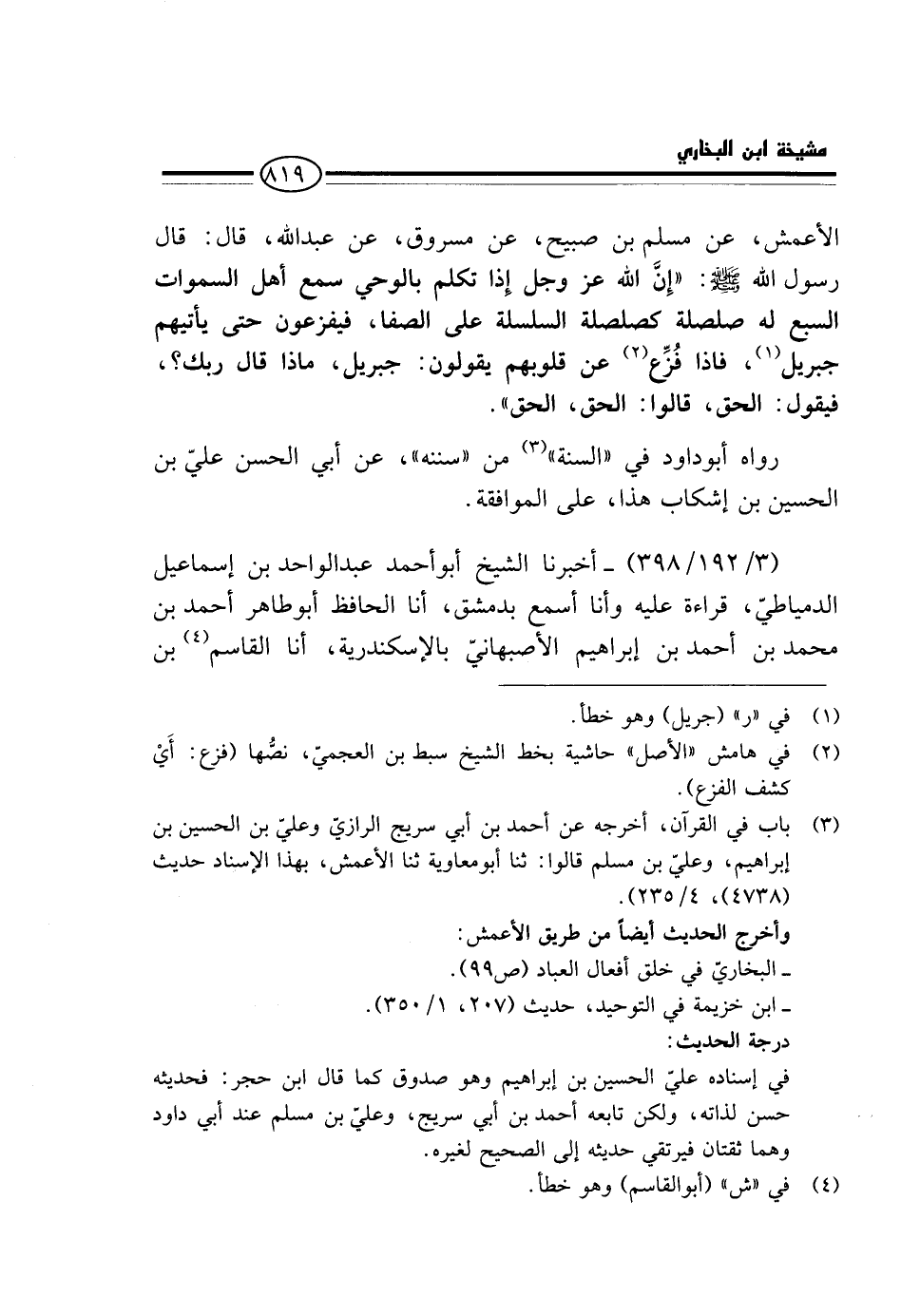 الأَعْمَشِ، عَنْ مُسْلِمِ بْنِ صُبَيْحٍ، عَنْ مَسْرُوقٍ، عَنْ عَبْدِ اللَّهِ، قَالَ: قَالَ رَسُولُ اللَّهِ - صَلَّى اللَّهُ عَلَيْهِ وَسَلَّم َ -: " إِنَّ اللَّهَ عَزَّ وَجَلَّ إِذَا تَكَلَّمَ بِالْوَحْيِ سَمِعَ أَهْلُ السَّمَوَاتِ السَّبْعِ لَهُ صَلْصَلَةً كَصَلْصَلَةِ السِّلْسِلَةِ عَلَى الصَّفَا، فَيُفَزَّعُونَ حَتَّى يَأْتِيَهُمْ جِبْرِيلُ، فَإِذَا فُزِّعَ عَنْ قُلُوبِهِمْ يَقُولُونَ: جِبْرِيلُ، مَاذَا قَالَ رَبُّكَ؟ ، فَيَقُولُ: الْحَقَّ، قَالُوا: الْحَقَّ، الْحَقَّ ".