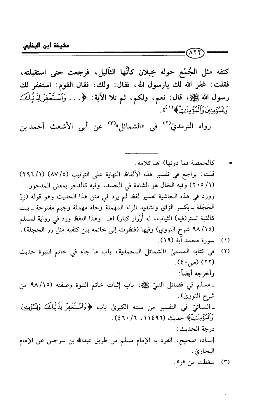 كَتِفِهِ مِثْلَ الْجُمْعِ حَوْلَهُ خِيلانٌ كَأَنَّهَا الثَّآلِيلُ، فَرَجَعْتُ حَتَّى اسْتَقْبَلْتُهُ، فَقُلْتُ: غَفَرَ اللَّهُ لَكَ يَا رَسُولَ اللَّهِ، فَقَالَ: وَلَكَ، فَقَالَ الْقَوْمُ: اسْتغْفر لَك رَسُول الله - صَلَّى اللَّهُ عَلَيْهِ وَسَلَّم َ -، قَالَ: نَعَمْ، وَلَكُمْ، ثُمَّ تَلا الآيَةَ: { ... وَاسْتَغْفِرْ لذنبك وَلِلْمُؤْمنِينَ وَالْمُؤْمِنَات} ".