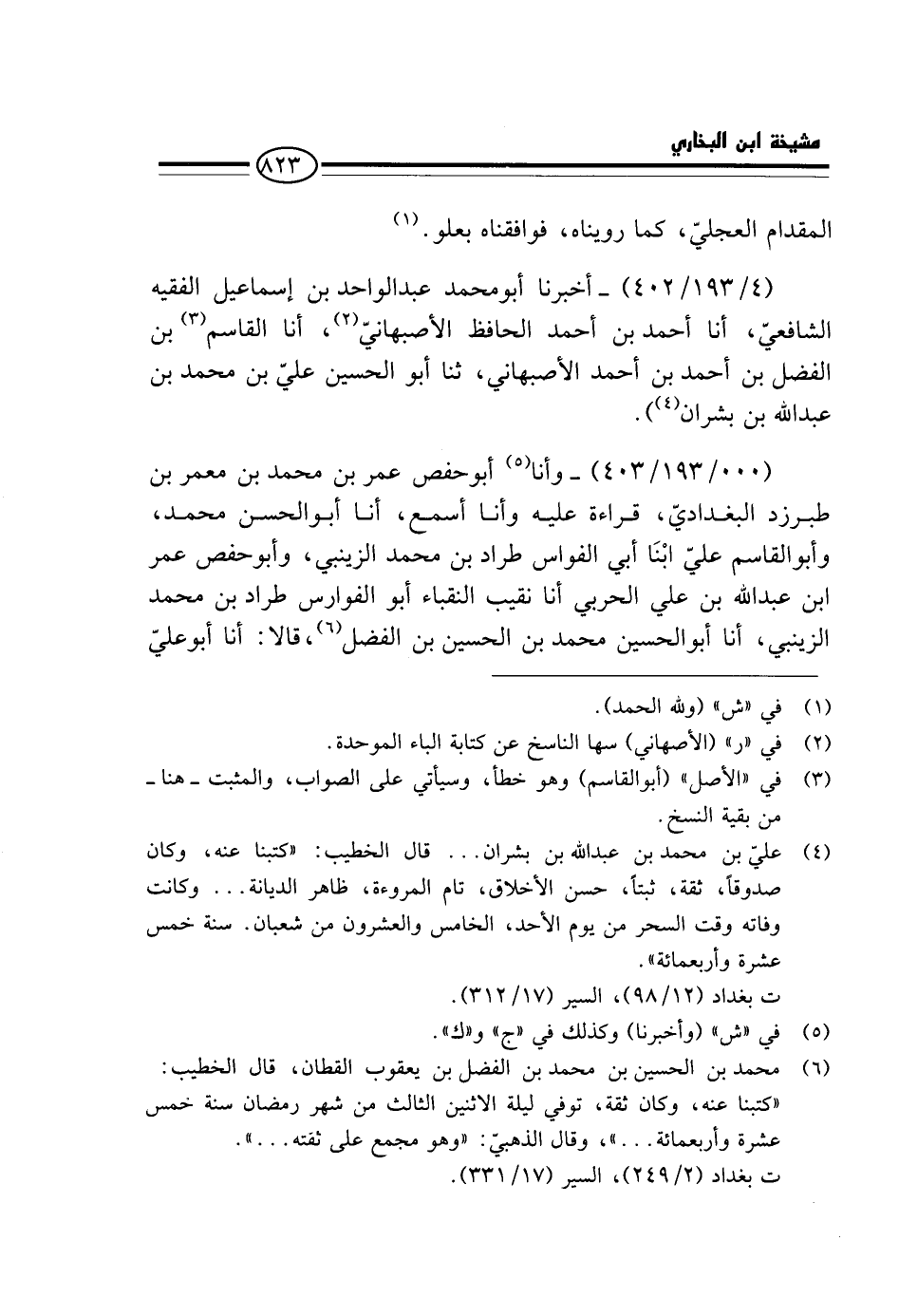 (000 / 193 / 403) - وَأَنا أَبُو حَفْصٍ عُمَرُ بْنُ مُحَمَّدِ بْنِ مَعْمَرِ بْنِ طَبَرْزَدَ الْبَغْدَادِيُّ، قِرَاءَةً عَلَيْهِ وَأَنَا أَسْمَعُ، أَنا أَبُو الْحَسَنِ مُحَمَّدٌ، وَأَبُو الْقَاسِمِ عَلِيٌّ ابْنا أبي الفواس طِرَادِ بْنِ مُحَمَّدٍ الزَّيْنَبِيِّ، وَأَبُو حَفْصٍ عُمَرُ ابْن عَبْدِ اللَّهِ بْنِ عَلِيٍّ الْحَرْبِيُّ أَنا نَقِيبُ النُّقَبَاءِ أَبُو الْفَوَارِسِ طِرَادُ بْنُ مُحَمَّدٍ الزَّيْنَبِيُّ، أَنا أَبُو الْحُسَيْنِ مُحَمَّدُ بْنُ الْحُسَيْنِ بْنِ الْفَضْلِ، قَالا: أَنا أَبُو عَلِيٍّ