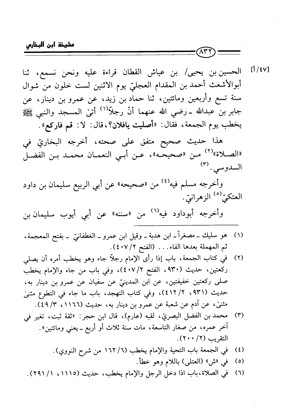 الْحُسَيْنُ بْنُ يَحْيَى بْنِ عَيَّاشٍ الْقَطَّانُ قِرَاءَةً عَلَيْهِ وَنَحْنُ نَسْمَعُ، ثَنَا أَبُو الأَشْعَثِ أَحْمَدُ بْنُ الْمِقْدَامِ الْعِجْلِيُّ يَوْمَ الاثْنَيْنِ لِسِتٍّ خَلَوْنَ مِنْ شَوَّالٍ سَنَةَ تِسْعٍ وَأَرْبَعِينَ وَمِائَتَيْنِ، ثَنَا حَمَّادُ بْنُ زَيْدٍ، عَنْ عَمْرِو بْنِ دِينَارٍ، عَنْ جَابِرِ بْنِ عَبْدِ اللَّهِ - رَضِيَ اللَّهُ عَنْهُمَا أَنَّ رَجُلا أَتَى الْمَسْجِدَ وَالنَّبِيُّ - صَلَّى اللَّهُ عَلَيْهِ وَسَلَّم َ - يَخْطُبُ يَوْمَ الْجُمُعَةِ، فَقَالَ: " أَصَلَّيْتَ يَا فُلانُ؟ ، قَالَ: لَا، قُمْ فَارْكَعْ ".