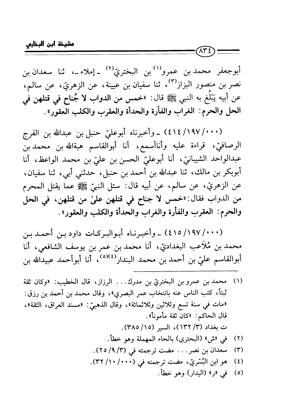أَبُو جَعْفَرٍ مُحَمَّدُ بْنُ عَمْرِو بْنِ الْبَخْتَرِيِّ - إِمْلاءً - ثَنَا سَعْدَانُ بْنُ نَصْرِ بْنِ مَنْصُورٍ الْبَزَّازُ، ثَنَا سُفْيَانُ بْنُ عُيَيْنَةَ، عَنِ الزُّهْرِيِّ، عَنْ سَالِمٍ، عَنْ أَبِيهِ يَبْلُغُ بِهِ النَّبِيَّ - صَلَّى اللَّهُ عَلَيْهِ وَسَلَّم َ - قَالَ: " خَمْسٌ مِنَ الدَّوَابِّ لَا جُنَاحَ فِي قَتْلِهِنَّ فِي الْحِلِّ وَالْحَرَمِ: الْغُرَابُ وَالْفَأْرَةُ وَالْحِدَأَةُ وَالْعَقْرَبُ وَالْكَلْبُ الْعَقُورُ ".