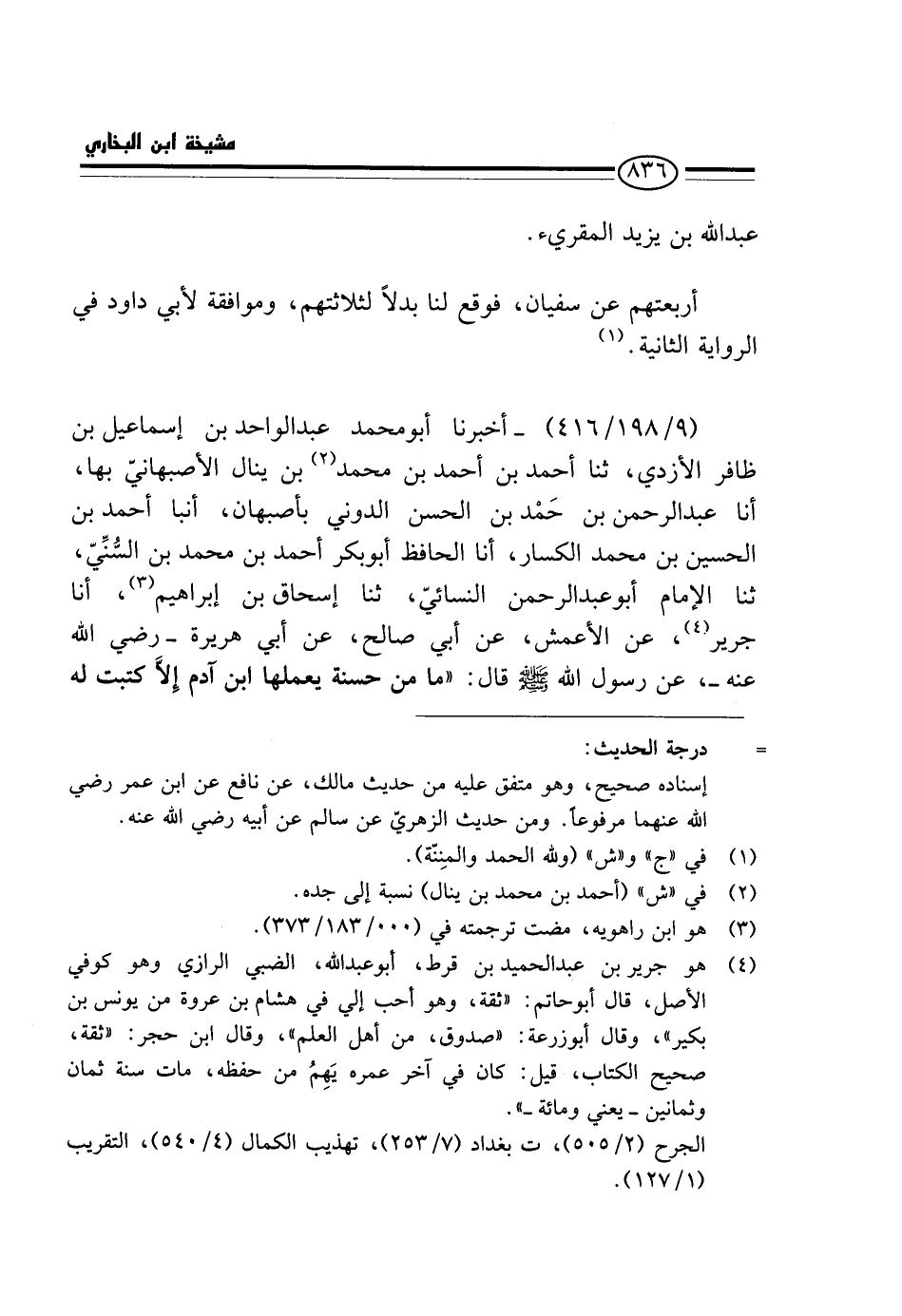 (9 / 198 / 416) - أَخْبَرَنَا أَبُو مُحَمَّد عبد الْوَاحِد بن إِسْمَاعِيل بن ظَافِرٍ الأَزْدِيُّ، ثَنَا أَحْمَدُ بْنُ أَحْمَدَ بْنِ مُحَمَّدِ بْنِ يَنَالَ الأَصْبَهَانِيُّ بِهَا، أَنا عَبْدُ الرَّحْمَنِ بْنُ حَمْدِ بْنِ الْحَسَنِ الدُّونِيُّ بِأَصْبَهَانَ، أنبا أَحْمَدُ بْنُ الْحُسَيْنِ بْنِ مُحَمَّدٍ الْكَسَّارُ، أَنا الْحَافِظُ أَبُو بَكْرٍ أَحْمَدُ بْنُ مُحَمَّدِ بْنِ السُّنِّيِّ، ثَنَا الإِمَامُ أَبُو عَبْدِ الرَّحْمَنِ النَّسَائِيُّ، ثَنَا إِسْحَاقُ بْنُ إِبْرَاهِيمَ، أَنا جَرِيرٌ، عَنِ الْأَعْمَشِ، عَنْ أَبِي صَالِح، عَنْ أَبِي هُرَيْرَةَ - رَضِيَ اللَّهُ عَنْهُ -، عَنْ رَسُولِ اللَّهِ - صَلَّى اللَّهُ عَلَيْهِ وَسَلَّم َ - قَالَ: " مَا مِنْ حَسَنَةٍ يَعْمَلُهَا ابْنُ آدَمَ إِلَّا كتبت لَهُ