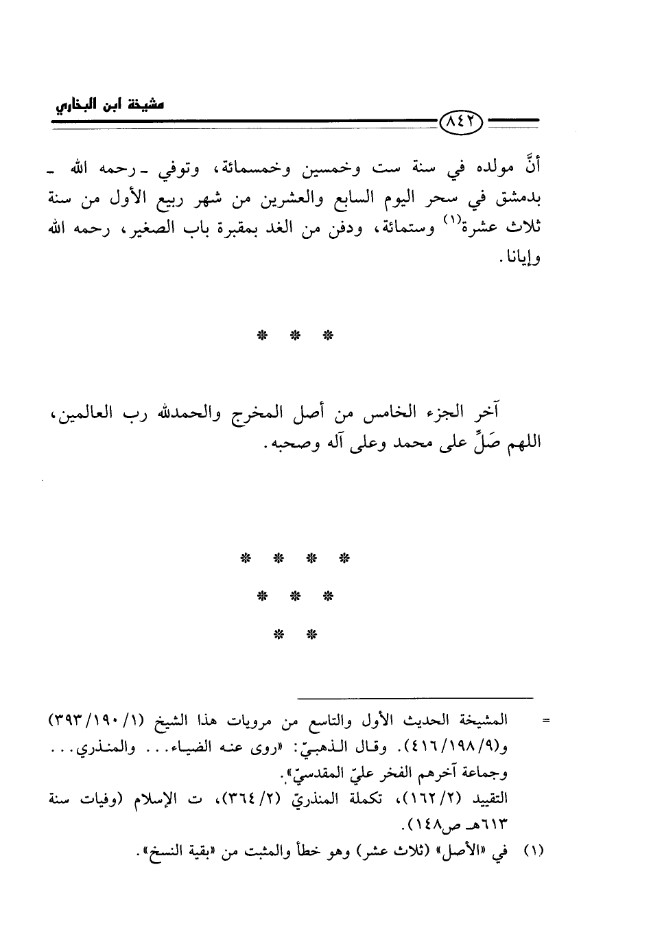 آخر الْجُزْء الْخَامِس من أصل الْمخْرج وَالْحَمْد لله رب الْعَالمين، اللَّهُمَّ صل على مُحَمَّد وعَلى آله وَصَحبه.