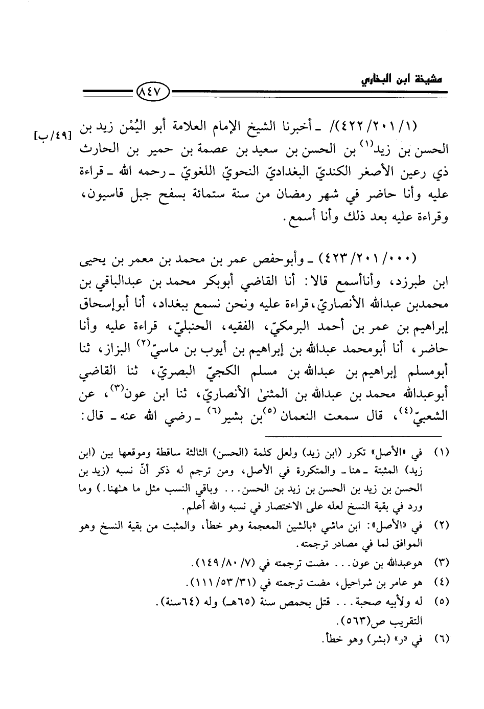 (000 / 201 / 423) - وَأَبُو حَفْصٍ عُمَرُ بْنُ مُحَمَّدِ بن معمر بن يحيى ابْن طَبَرْزَدَ، وَأَنَا أَسْمَعُ قَالا: أَنا الْقَاضِي أَبُو بَكْرٍ مُحَمَّدُ بْنُ عَبْدِ الْبَاقِي بْنِ مُحَمَّدٍ بْنِ عَبْدِ اللَّهِ الأَنْصَارِيُّ، قِرَاءَةً عَلَيْهِ وَنَحْنُ نَسْمَعُ بِبَغْدَادَ، أَنَا أَبُو إِسْحَاقَ إِبْرَاهِيمُ بْنُ عُمَرَ بْنِ أَحْمَدَ الْبَرْمَكِيُّ، الْفَقِيهُ، الْحَنْبَلِيُّ، قِرَاءَةً عَلَيْهِ وَأَنَا حَاضِرٌ، أَنَا أَبُو مُحَمَّدٍ عَبْدُ اللَّهِ بْنُ إِبْرَاهِيمَ بْنِ أَيُّوبَ بْنِ مَاسِيٍّ الْبَزَّازُ، ثَنَا أَبُو مُسْلِمٍ إِبْرَاهِيمُ بْنُ عَبْدِ اللَّهِ بْنِ مُسْلِمٍ الْكَجِّيُّ الْبَصْرِيُّ، ثَنَا الْقَاضِي أَبُو عَبْدِ اللَّهِ مُحَمَّدُ بْنُ عَبْدِ اللَّهِ بْنِ الْمُثَنَّى الأَنْصَارِيُّ، ثَنَا ابْنُ عَوْنٍ، عَنِ الشَّعْبِيِّ، قَالَ سَمِعْتُ النُّعْمَانَ بْنَ بَشِيرٍ - رَضِيَ الله عَنهُ - قَالَ: