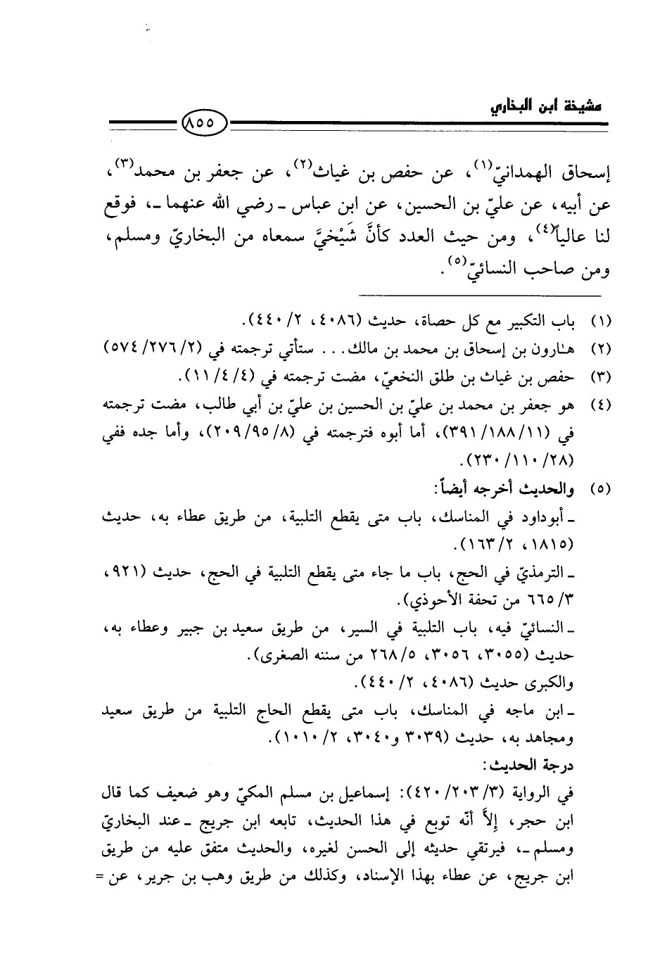 إِسْحَاق الْهَمدَانِي، عَن حَفْص بن غياث، عَن جَعْفَر بن مُحَمَّد، عَن أَبِيه، عَن عَليّ بن الْحُسَيْن، عَن ابْن عَبَّاس - رَضِي الله عَنْهُمَا -، فَوَقع لنا عَالِيا، وَمن حَيْثُ الْعدَد كَأَن شَيْخي سمعاه من البُخَارِيّ وَمُسلم، وَمن صَاحب النَّسَائِيّ.