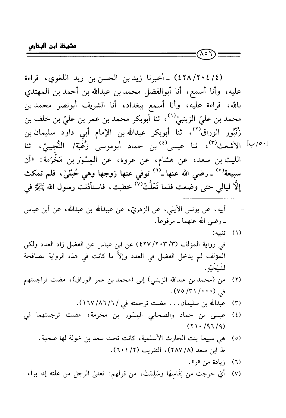 (4 / 204 / 428) - أَخْبَرَنَا زَيْدُ بْنُ الْحَسَنِ بْنِ زَيْدٍ اللُّغَوِيُّ، قِرَاءَة عَلَيْهِ، وَأَنَا أسمع، أَنَا أَبُو الْفَضْلِ مُحَمَّدُ بْنُ عَبْدِ اللَّهِ بْنِ أَحْمَدَ بْنِ الْمُهْتَدِي بِاللَّهِ، قِرَاءَةً عَلَيْهِ، وَأَنَا أَسْمَعُ بِبَغْدَادَ، أَنَا الشَّرِيفُ أَبُو نَصْرٍ مُحَمَّدُ بْنُ مُحَمَّدِ بْنِ عَلِيٍّ الزَّيْنَبِيُّ، ثَنَا أَبُو بَكْرٍ مُحَمَّدُ بْنُ عُمَرَ بْنِ عَلِيِّ بْنِ خَلَفِ بْنِ زُنْبُورٍ الْوَرَّاقُ، ثَنَا أَبُو بَكْرٍ عَبْدُ اللَّهِ بن الإِمَامِ أَبِي دَاوُدَ سُلَيْمَانَ بْنِ الأَشْعَثِ، ثَنَا عِيسَى بْنُ حَمَّادٍ أَبُو مُوسَى زُغْبَةُ التُّجِيبِيُّ، ثَنَا اللَّيْثُ بْنُ سَعْدٍ، عَنْ هِشَامٍ، عَنْ عُرْوَةَ، عَنِ الْمِسْوَرِ بْنِ مَخْرَمَةَ: " أَنَّ سُبَيْعَةَ - رَضِي الله عَنهُ - تُوُفِّيَ عَنْهَا زَوْجُهَا وَهِيَ حُبْلَى، فَلَمْ تَمْكُثْ إِلا لَيَالِيَ حَتَّى وَضَعَتْ فَلَمَّا تَعَلَّتْ خُطِبَتْ، فاستأذنت رَسُول الله - صَلَّى اللَّهُ عَلَيْهِ وَسَلَّم َ - فِي