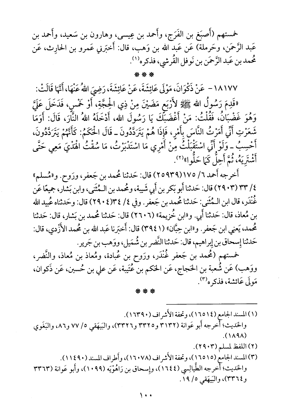 خمستهم (محمد بن جعفر غُندَر، وروح بن عبادة، ومعاذ بن معاذ، والنضر، ووهب) عن شعبة بن الحجاج، عن الحكم بن عتيبة، عن علي بن حسين، عن ذكوان مولى عائشة، فذكره (¬٢).