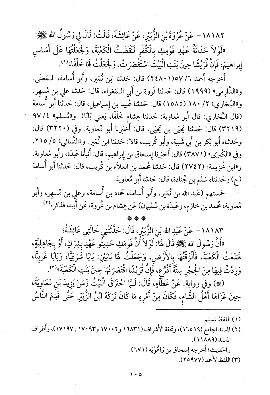 «أن رسول الله صَلى الله عَليه وسَلم قال لها: لولا أن قومك حديثو عهد بشرك، أو بجاهلية، لهدمت الكعبة، فألزقتها بالأرض، وجعلت لها بابين: بابا شرقيا، وبابا غربيا، وزدت فيها من الحجر ستة أذرع، فإن قريشا اقتصرتها حين بنت الكعبة» (¬١).