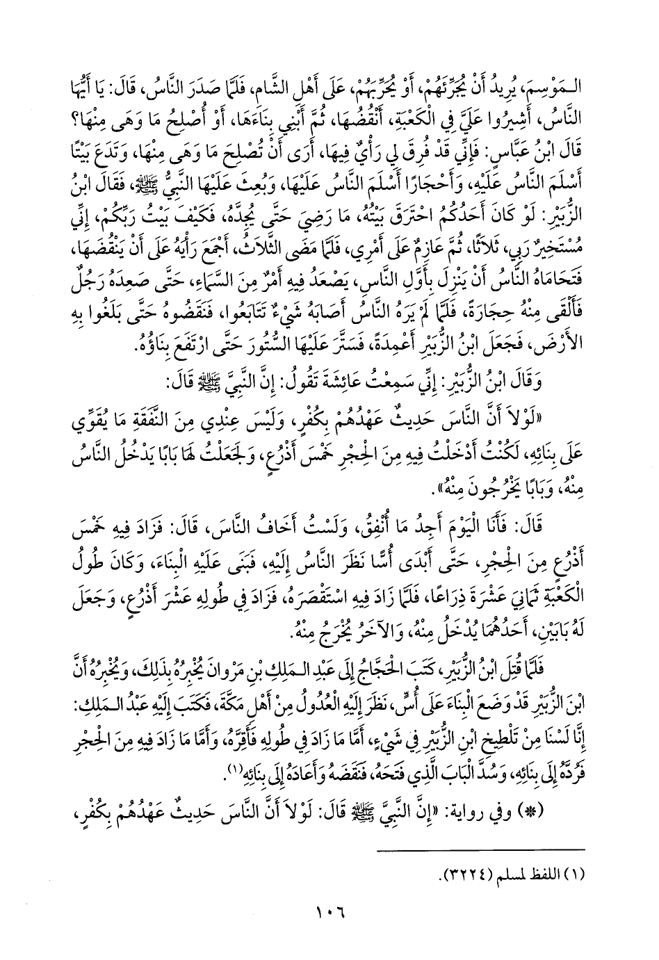 - وفي رواية: «قال لي رسول الله صَلى الله عَليه وسَلم: يا عائشة، لولا أن قومك حديث عهد بجاهلية، لهدمت البيت، حتى أدخل فيه ما أخرجوا منه في الحجر، فإنهم عجزوا عن نفقته، وجعلت له بابين: بابا شرقيا، وبابا غربيا، وألصقته بالأرض، ووضعته على أساس إبراهيم».