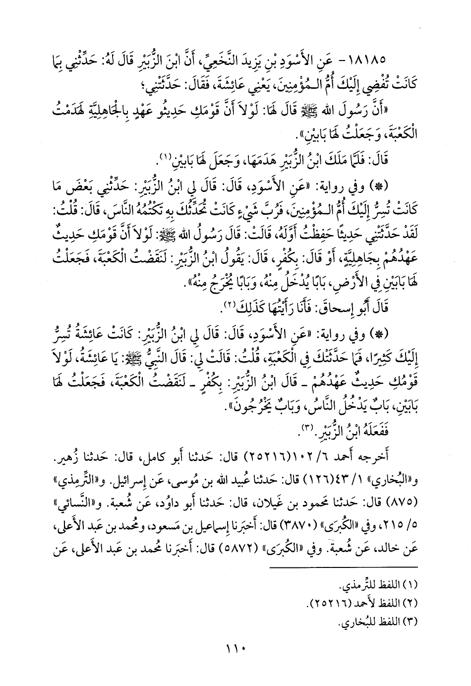 - وفي رواية: «عن الأسود، قال: قال لي ابن الزبير: حدثني بعض ما كانت تسر إليك أُم المؤمنين، فرب شيء كانت تحدثك به تكتمه الناس، قال: قلت: لقد حدثتني حديثا حفظت أوله، قالت: قال رسول الله صَلى الله عَليه وسَلم: لولا أن قومك حديث عهدهم بجاهلية، أو قال: بكفر، قال: يقول ابن الزبير: لنقضت الكعبة، فجعلت لها بابين في الأرض، بابا يدخل منه، وبابا يخرج منه».