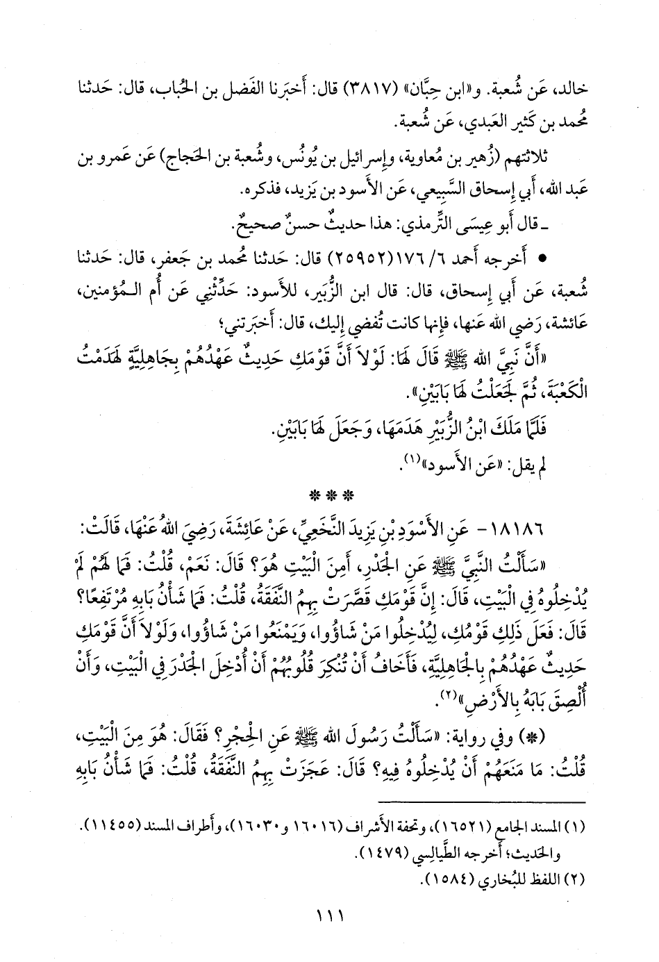 - وفي رواية: «سألت رسول الله صَلى الله عَليه وسَلم عن الحجر؟ فقال: هو من البيت، قلت: ما منعهم أن يدخلوه فيه؟ قال: عجزت بهم النفقة، قلت: فما شان بابه