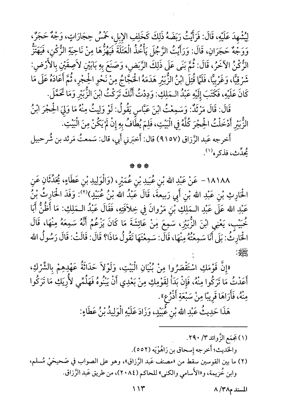 ١٨١٨٨ - عن عبد الله بن عُبيد بن عُمير، والوليد بن عطاء، يحدثان عن الحارث بن عبد الله بن أبي ربيعة، قال عبد الله بن عبيد: وفد الحارث بن عبد الله على عبد الملك بن مروان في خلافته، فقال عبد الملك: ما أظن أبا خبيب، يعني ابن الزبير، سمع من عائشة ما كان يزعم أنه سمعه منها، قال الحارث: بلى أنا سمعته منها، قال: سمعتها تقول ماذا؟ قال: قالت: قال رسول الله صَلى الله عَليه وسَلم: