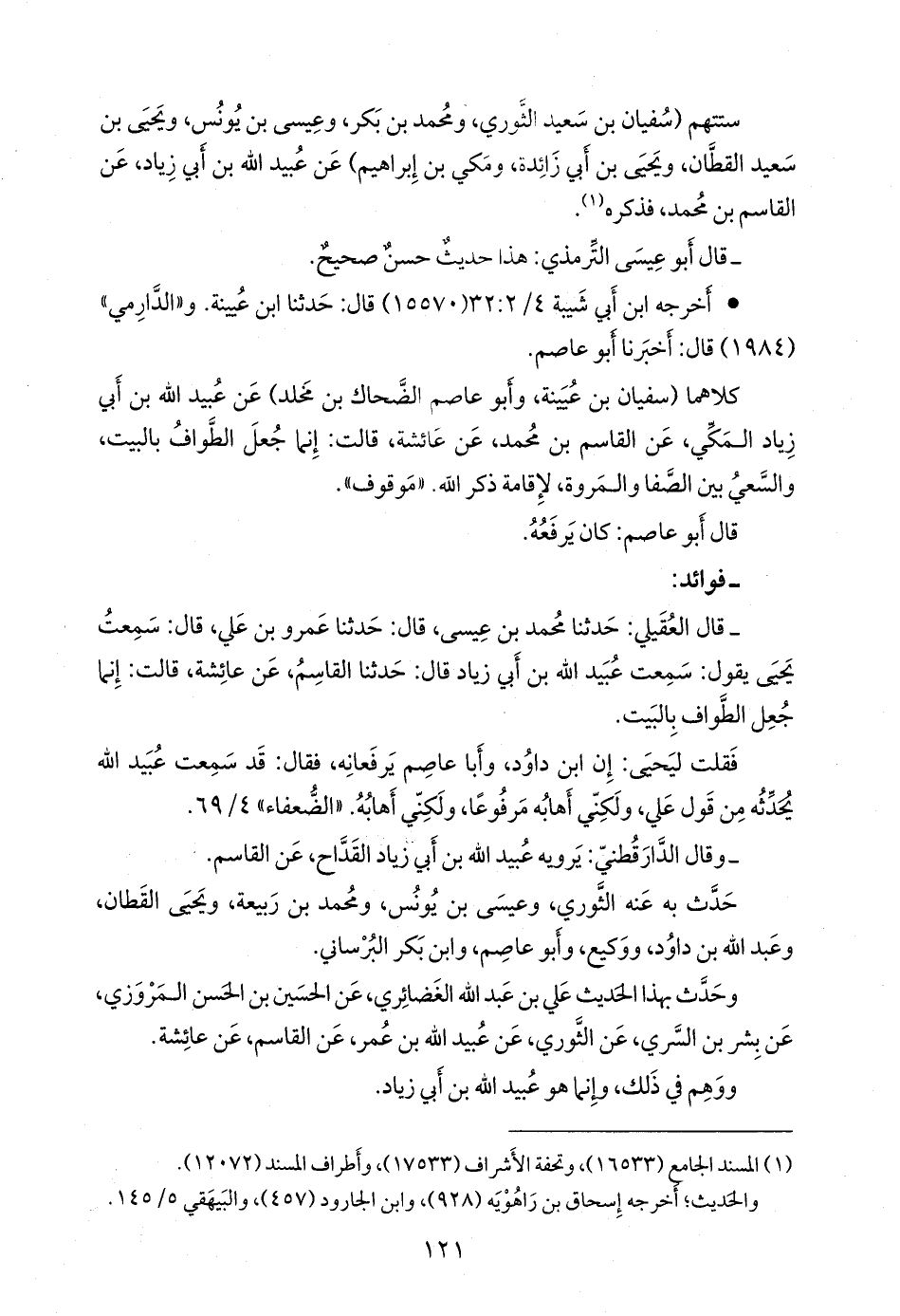- قال العُقيلي: حدثنا محمد بن عيسى، قال: حدثنا عَمرو بن علي، قال: سمعت يحيى يقول: سمعت عُبيد الله بن أبي زياد قال: حدثنا القاسم، عن عائشة، قالت: إنما جعل الطواف بالبيت.
