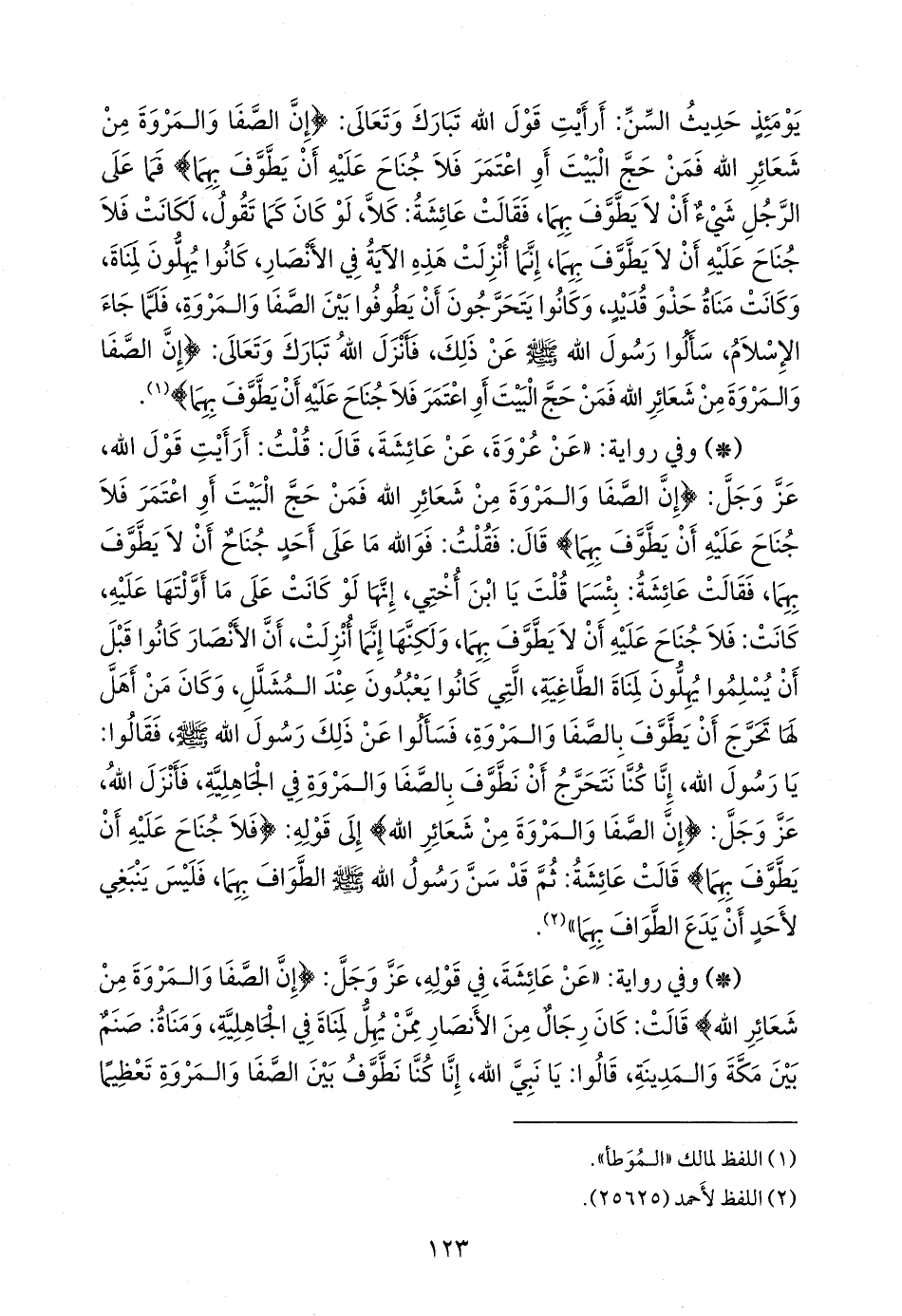 - وفي رواية: «عن عروة بن الزبير، قال: قلت لعائشة، زوج النبي صَلى الله عَليه وسَلم: ما أرى على أحد لم يطف بين الصفا والمروة شيئا، وما أبالي أن لا أطوف بينهما، قالت: بئس ما قلت يا ابن أختي، طاف رسول الله صَلى الله عَليه وسَلم وطاف المسلمون، فكانت سنة، وإنما كان من أهل لمناة الطاغية التي بالمشلل، لا يطوفون بين الصفا والمروة، فلما كان الإسلام سألنا النبي صَلى الله عَليه وسَلم عن ذلك؟ فأنزل الله، عز وجل: {إن الصفا والمروة من شعائر الله فمن حج البيت أو اعتمر فلا جناح عليه أن يطوف بهما} ولو كانت كما تقول، لكانت: فلا جناح عليه أن لا يطوف بهما».