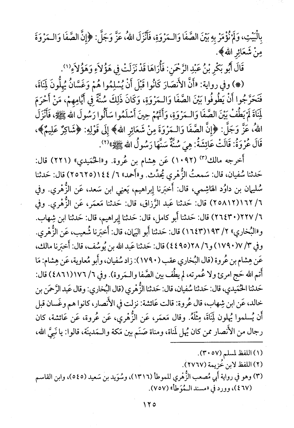 وفي ٦/ ٢٢٧ (٢٦٤٣٠) قال: حدثنا أَبو كامل، قال: حدثنا إبراهيم، قال: حدثنا ابن شهاب. و «البخاري» ٢/ ١٩٣ (١٦٤٣) قال: حدثنا أَبو اليمان، قال: أخبرنا شعيب، عن الزُّهْري. وفي ٣/ ٧ (١٧٩٠) و ٦/ ٢٨ (٤٤٩٥) قال: حدثنا عبد الله بن يوسف، قال: أخبرنا مالك، عن هشام بن عروة (قال البخاري عقب (١٧٩٠): زاد سفيان، وأَبو معاوية، عن هشام: ما أتم الله حج امرئ ولا عمرته، لم يطف بين الصفا والمروة). وفي ٦/ ١٧٦ (٤٨٦١) قال: حدثنا الحميدي، قال: حدثنا سفيان، قال: حدثنا الزُّهْري (قال البخاري: وقال عبد الرَّحمَن بن خالد، عن ابن شهاب، قال عروة: قالت عائشة: نزلت في الأنصار، كانوا هم وغسان قبل أن يسلموا يهلون لمناة، مثله. وقال مَعمَر، عن الزُّهْري، عن عروة، عن عائشة، كان رجال من الأنصار ممن كان يهل لمناة، ومناة صنم بين مكة والمدينة، قالوا: يا نبي الله،
