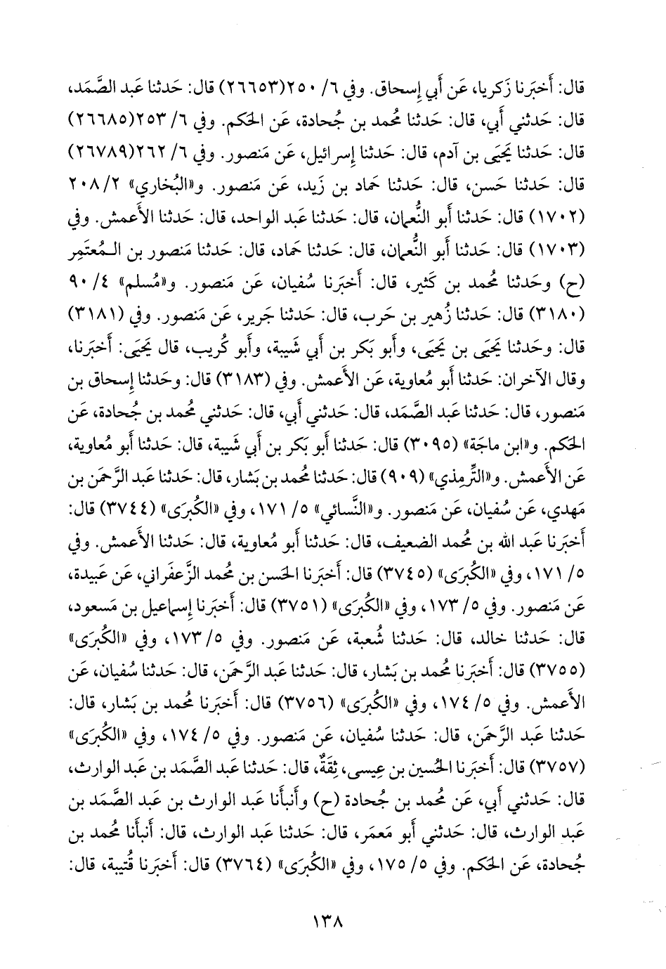 و «البخاري» ٢/ ٢٠٨ (١٧٠٢) قال: حدثنا أَبو النعمان، قال: حدثنا عبد الواحد، قال: حدثنا الأعمش. وفي (١٧٠٣) قال: حدثنا أَبو النعمان، قال: حدثنا حماد، قال: حدثنا منصور بن المُعتَمِر (ح) وحدثنا محمد بن كثير، قال: أخبرنا سفيان، عن منصور. و «مسلم» ٤/ ٩٠ (٣١٨٠) قال: حدثنا زهير بن حرب، قال: حدثنا جرير، عن منصور. وفي (٣١٨١) قال: وحدثنا يحيى بن يحيى، وأَبو بكر بن أبي شيبة، وأَبو كُريب، قال يحيى: أخبرنا، وقال الآخران: حدثنا أَبو معاوية، عن الأعمش. وفي (٣١٨٣) قال: وحدثنا إسحاق بن منصور، قال: حدثنا عبد الصمد، قال: حدثني أبي، قال: حدثني محمد بن جحادة، عن الحكم. و «ابن ماجة» (٣٠٩٥) قال: حدثنا أَبو بكر بن أبي شيبة، قال: حدثنا أَبو معاوية، عن الأعمش. و «التِّرمِذي» (٩٠٩) قال: حدثنا محمد بن بشار، قال: حدثنا عبد الرَّحمَن بن مهدي، عن سفيان، عن منصور. و «النَّسَائي» ٥/ ١٧١، وفي «الكبرى» (٣٧٤٤) قال: أخبرنا عبد الله بن محمد الضعيف، قال: حدثنا أَبو معاوية، قال: حدثنا الأعمش. وفي ٥/ ١٧١، وفي «الكبرى» (٣٧٤٥) قال: أخبرنا الحسن بن محمد الزعفراني، عن عبيدة، عن منصور. وفي ٥/ ١٧٣، وفي «الكبرى» (٣٧٥١) قال: أخبرنا إسماعيل بن مسعود، قال: حدثنا خالد، قال: حدثنا شعبة، عن منصور. وفي ٥/ ١٧٣، وفي «الكبرى» (٣٧٥٥) قال: أخبرنا محمد بن بشار، قال: حدثنا عبد الرَّحمَن، قال: حدثنا سفيان، عن الأعمش. وفي ٥/ ١٧٤، وفي «الكبرى» (٣٧٥٦) قال: أخبرنا محمد بن بشار، قال: حدثنا عبد الرَّحمَن، قال: حدثنا سفيان، عن منصور. وفي ٥/ ١٧٤، وفي «الكبرى» (٣٧٥٧) قال: أخبرنا الحسين بن عيسى، ثقة، قال: حدثنا عبد الصمد بن عبد الوارث، قال: حدثني أبي، عن محمد بن جحادة (ح) وأنبأنا عبد الوارث بن عبد الصمد بن عبد الوارث، قال: حدثني أَبو مَعمَر، قال: حدثنا عبد الوارث، قال: أنبأنا محمد بن جحادة، عن الحكم. وفي ٥/ ١٧٥، وفي «الكبرى» (٣٧٦٤) قال: أخبرنا قتيبة، قال: