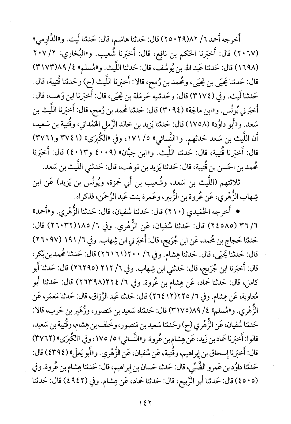 • أَخرجه الحُميدي (٢١٠) قال: حدثنا سفيان، قال: حدثنا الزُّهْري. و «أحمد» ٦/ ٣٦ (٢٤٥٨٥) قال: حدثنا سفيان، عن الزُّهْري. وفي ٦/ ١٨٥ (٢٦٠٣٢) قال: حدثنا حجاج بن محمد، عن ابن جُريج، قال: أخبرني ابن شهاب. وفي ٦/ ١٩١ (٢٦٠٩٧) قال: حدثنا يحيى، قال: حدثنا هشام. وفي ٦/ ٢٠٠ (٢٦١٦١) قال: حدثنا محمد بن بكر، قال: أخبرنا ابن جُريج، قال: حدثني ابن شهاب. وفي ٦/ ٢١٢ (٢٦٢٩٥) قال: حدثنا أَبو كامل، قال: حدثنا حماد، عن هشام بن عروة. وفي ٦/ ٢٢٤ (٢٦٣٩٨) قال: حدثنا أَبو معاوية، عن هشام. وفي ٦/ ٢٢٥ (٢٦٤١٢) قال: حدثنا عبد الرزاق، قال: حدثنا مَعمَر، عن الزُّهْري. و «مسلم» ٤/ ٨٩ (٣١٧٥) قال: حدثناه سعيد بن منصور، وزهير بن حرب، قالا: حدثنا سفيان، عن الزُّهْري (ح) وحدثنا سعيد بن منصور، وخلف بن هشام، وقتيبة بن سعيد، قالوا: أخبرنا حماد بن زيد، عن هشام بن عروة. و «النَّسَائي» ٥/ ١٧٥، وفي «الكبرى» (٣٧٦٢) قال: أخبرنا إسحاق بن إبراهيم، وقتيبة، عن سفيان، عن الزُّهْري. و «أَبو يَعلى» (٤٣٩٤) قال: حدثنا داود بن عَمرو الضبي، قال: حدثنا حسان بن إبراهيم، قال: حدثنا هشام بن عروة. وفي (٤٥٠٥) قال: حدثنا أَبو الربيع، قال: حدثنا حماد، عن هشام. وفي (٤٩٤٢) قال: حدثنا